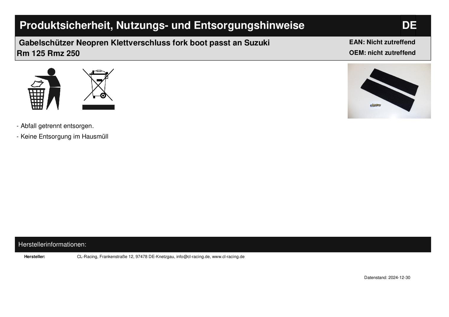 In dieser Auktion gibt es folgenden Artikel zu kaufen: Neopren Gabelschutz mit Klettverschluss passend fü r: alle gängigen Enduros und Crosser mit einem Gabeldurchmesser von Ø 43 - 50 mm Größe: Gabeldurchmesser = Ø 43 - 50 mm Länge = 350 mm (kann gekürzt werden) Artikelbeschreibung: Gabelschützer mit extra dicker Materialstärke von 3 mm wird durch Klettverschluss schnell über Tauchrohr montiert - schützt Tauchrohr und Gabeldichtringe vor Sand, Schlamm und Steinen! Lieferumfang: links + rechts Artikelzustand: neu Bei Unklarheiten oder Fragen bitte erst E-Mail schreiben.