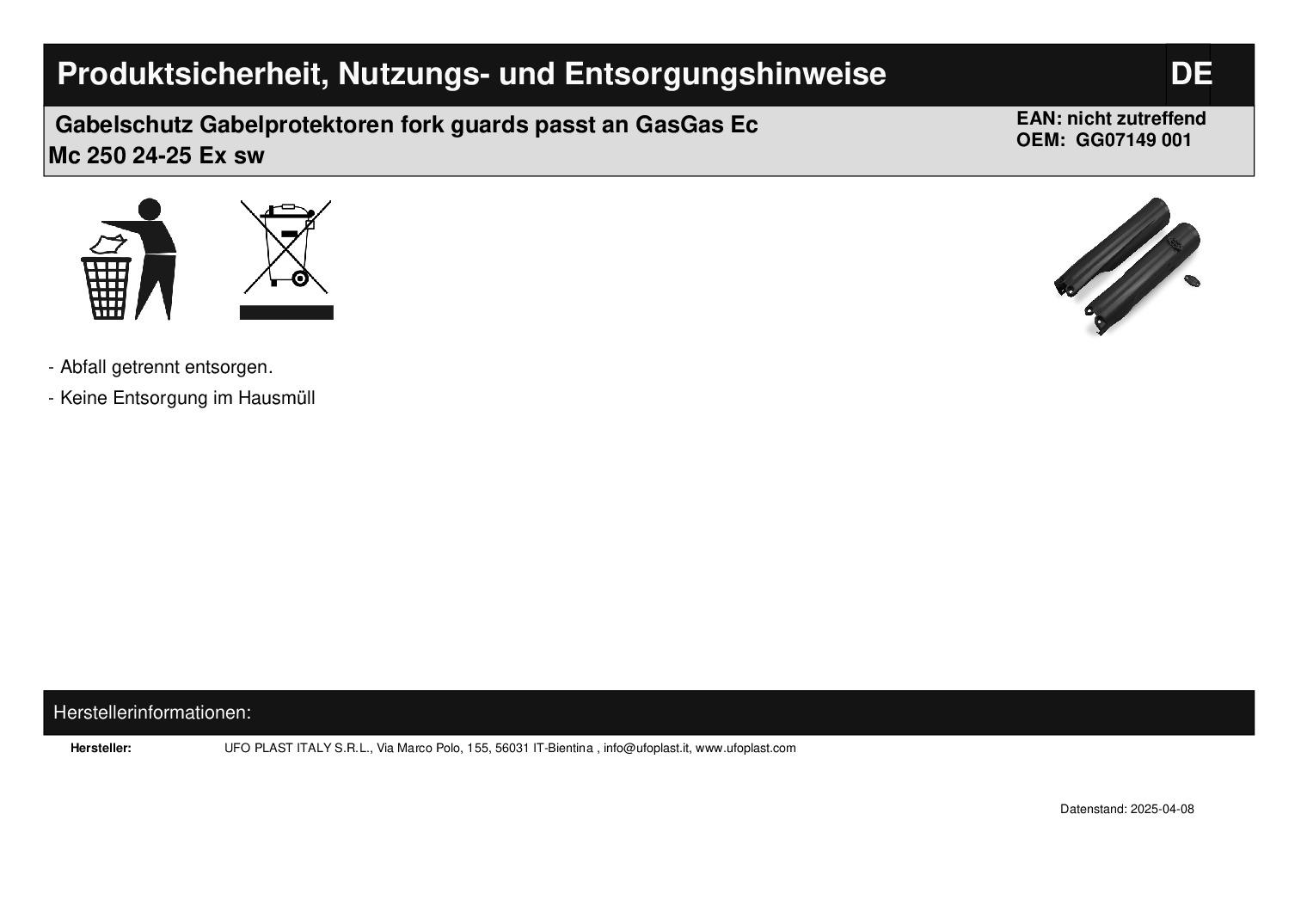 In dieser Auktion gibt es folgenden Artikel zu kaufen: Gabelprotektoren (ähnlich Foto) Modell: passend für GasGas MC 125 Bj.: 2024 - 2025 MC 150 Bj.: 2025 EC 125 Bj.: 2025 MC 250 Bj.: 2024 - 2025 EC 250 Bj.: 2024 - 2025 MC 300 Bj.: 2025 EC 300 Bj.: 2024 - 2025 MC 250 F Bj.: 2024 - 2025 EX 250 Bj.: 2024 - 2025 EC 250 F Bj.: 2024 - 2025 EX 250 F Bj.: 2024 - 2025 EX 300 Bj.: 2024 - 2025 MC 350 F Bj.: 2024 - 2025 EC 350 F Bj.: 2024 - 2025 EX 350 F Bj.: 2024 - 2025 MC 450 F Bj.: 2024 - 2025 EX 450 F Bj.: 2024 - 2025 EC 450 F Bj.: 2024 - 2025 EC 500 F Bj.: 2024 - 2025 passend für Husqvarna TC 250 Bj.: 2023 - 2025 TE 250 Bj.: 2024 - 2025 TC 125 Bj.: 2023 - 2025 FC 250 Bj.: 2023 - 2025 FE 250 Bj.: 2024 - 2025 TE 300 Bj.: 2024 - 2025 FC 350 Bj.: 2023 - 2025 FE 350 Bj.: 2024 - 2025 FC 450 Bj.: 2023 - 2025 FE 450 Bj.: 2024 - 2025 FE 501 Bj.: 2024 - 2025 TC 300 Bj.: 2025 TX 300 Bj.: 2023 - 2025 TE 150 Bj.: 2024 - 2025 FX 350 Bj.: 2023 - 2025 FX 450 Bj.: 2023 - 2025 TC 150 Bj.: 2025 FE 350 Bj.: 2024 - 2025 FE 450 Bj.: 2024 - 2025 FE 501 Bj.: 2024 - 2025 passend für KTM SX 250 Bj.: 2023 - 2026 SX 125 Bj.: 2023 - 2026 SX 150 Bj.: 2025 EXC 150 Bj.: 2024 - 2025 EXC 250 Bj.: 2024 - 2025 EXC-F 250 Bj.: 2024 - 2025 EXC 300 Bj.: 2024 - 2026 SX-F 350 Bj.: 2023 - 2026 EXC-F 350 Bj.: 2024 - 2026 SX-F 450 Bj.: 2023 - 2026 EXC-F 450 Bj.: 2024 - 2025 EXC-F 500 Bj.: 2024 - 2026 SX 300 Bj.: 2023 - 2025 SX-F 250 Bj.: 2023 - 2026 XC-W 125 Bj.: 2024 - 2026 XC 125 Bj.: 2023 - 2025 XC-W 150 Bj.: 2024 - 2026 XC-W 250 Bj.: 2024 - 2026 XC-F 250 Bj.: 2023 - 2026 XC 250 Bj.: 2023 - 2026 XC-W 300 Bj.: 2024 - 2026 XC 300 Bj.: 2023 - 2026 XC-F 350 Bj.: 2023 - 2025 XC-F 450 Bj.: 2023 - 2026 XC-F 500 Bj.: 2025 Lieferumfang: 1 Paar Artikelzustand: neu Hierbei handelt es sich um kein Originalteil! Bei Unklarheiten oder Fragen bitte erst E-Mail schreiben.