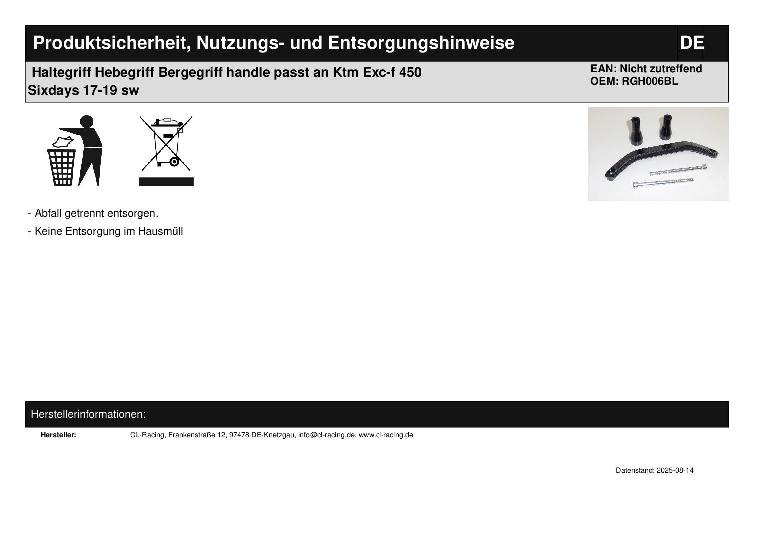 In dieser Auktion gibt es folgenden Artikel zu kaufen: Haltegriff (siehe Foto) Modell: passend für Ktm EXC-F 450 Sixdays Bj.: 17 - 19 (4-Takt) XC-F 450 Bj.: 16 - 18 Artikelbeschreibung: Der Haltegriff aus eloxiertem Aluminium wird am Heckrahmen an den beiden Bohrungen, an denen auch die Auspuffhalter sitzen, verschraubt. Lochabstand: ca. 170 mm Lieferumfang: siehe Foto Artikelzustand: neu Es handelt sich hierbei um kein Originalteil Bei Unklarheiten oder Fragen bitte erst E-Mail schreiben.