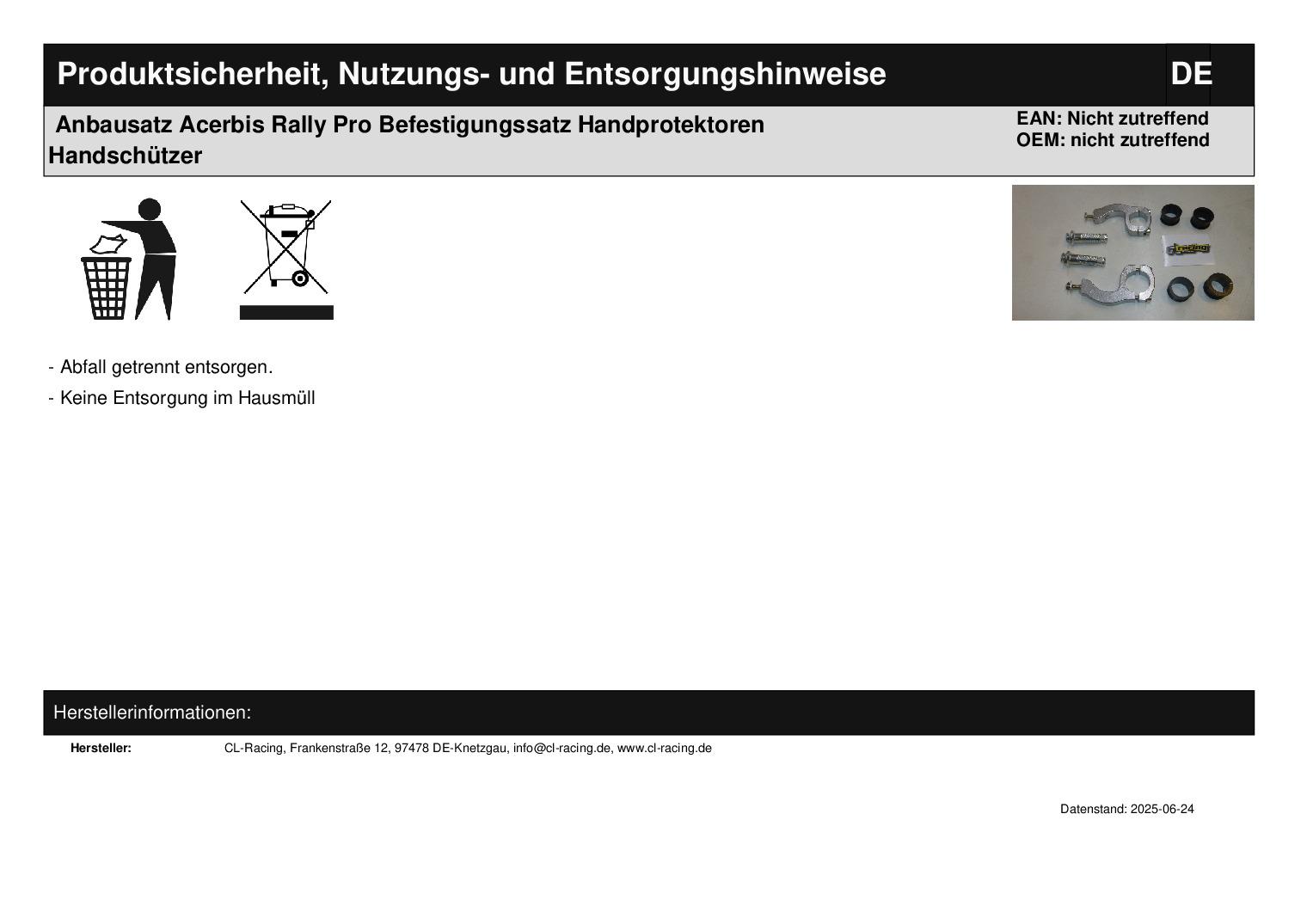 In dieser Auktion gibt es folgenden Artikel zu kaufen: Befestigungskit (siehe Foto) passend für: z. B. Acerbis Rally Pro, Multiplo E usw. Lieferumfang: Befestigungskit für Lenker mit Ø 22 - 28,6 mm (passt auch für konische Lenker wie Magura etc.) und Lenkerinnendurchmesser > 14 mm Artikelzustand: neu Bei Unklarheiten oder Fragen bitte erst E-Mail schreiben.