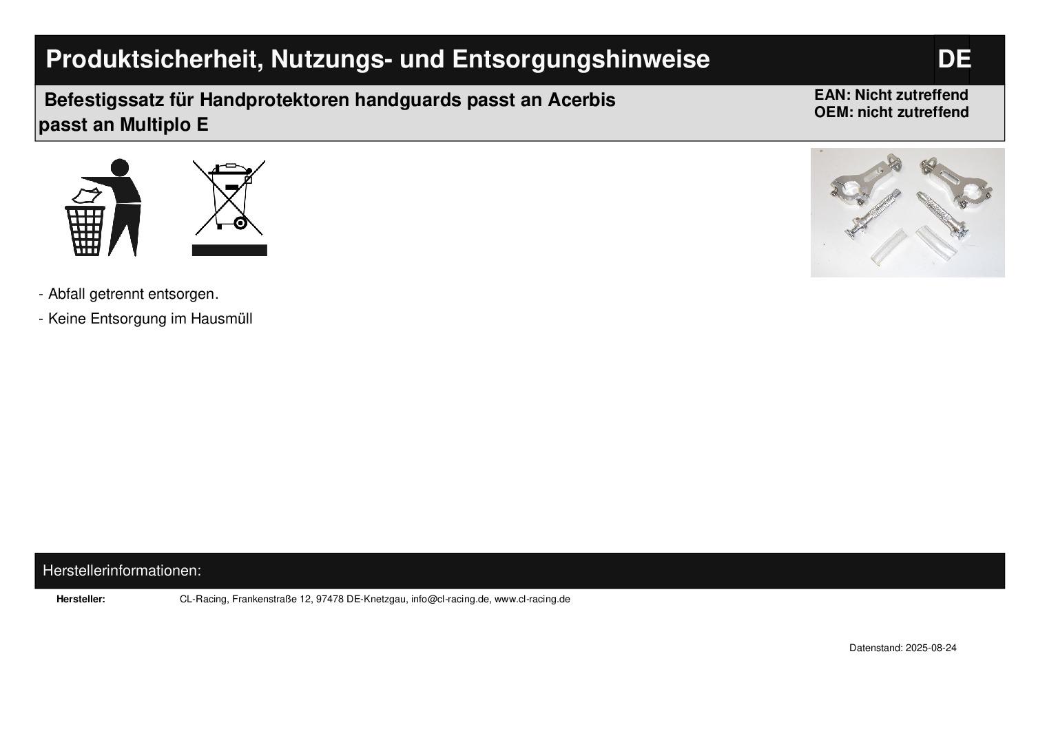 In dieser Auktion gibt es folgenden Artikel zu kaufen: Befestigungskit (siehe Foto) passend für: z. B. Acerbis Rally Pro, Multiplo E usw. Lieferumfang: Befestigungskit für Lenker mit Ø 22 mm (nicht passend für konische Lenker wie Magura etc.) und Lenkerinnendurchmesser > 12 mm Artikelzustand: neu Bei Unklarheiten oder Fragen bitte erst E-Mail schreiben.