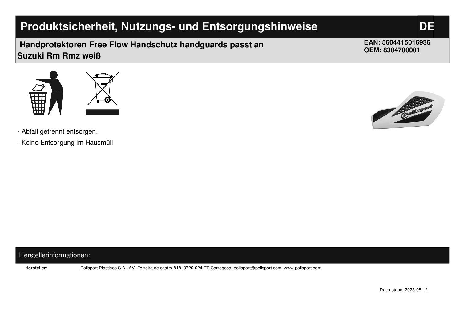 In dieser Auktion gibt es folgenden Artikel zu kaufen: Handguards + Befestigungskit (siehe Foto) Hersteller : Polisport Free Flow Artikelbeschreibung: universelles Handprotektorenpaar Freeflow; produziert mit DGP (Durable Gloss Polypropylene). Diese Kunststoff-Komposition ermöglicht ein Maximum an Glanz und Stabilität. - geeignet für MX, Enduro, ATV - einfache Montage (direkt am Lenker) - hohe Schlagfestigkeit - horizontal in 4 Stufen einstellbar - Bi-Material: Polypropylene und Gummi - integrierte Belüftungslöcher - separate Abdeckung zum Schließen der Belüftungslöcher (im Lieferumfang enthalten) - inklusive Befestigungssatz aus Plastik Lieferumfang : Handguards mit Befestigungskit für diverse Lenkeraußendurchmesser Artikelzustand : neu Bei Unklarheiten oder Fragen bitte erst E-Mail schreiben.