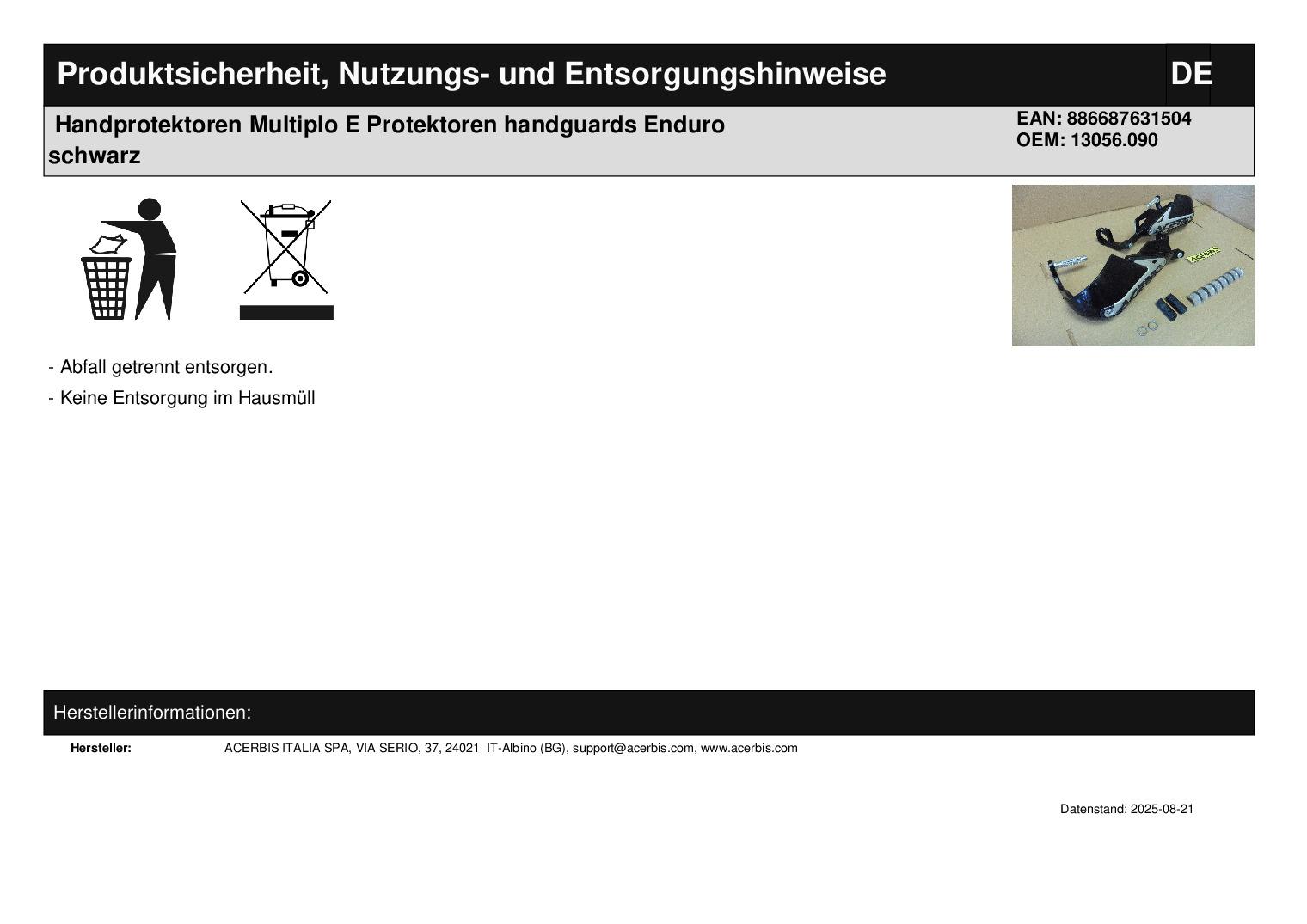 In dieser Auktion gibt es folgenden Artikel zu kaufen: Handguards inkl. Anbauteile (ähnlich Foto) Hersteller: Acerbis Multiplo E Farbe: schwarz - Bügel schwarz! Artikelbeschreibung: sehr robuste Handguards der Marke Acerbis, verstärkt durch rundum laufenden schwarzen Alubügel; mit Befestigungskit für Lenker, Anbauanleitung und AufkleberLieferumfang: Handguards mit Montagekit für Lenker mit 22 mm und 28 mm Durchmesser Artikelzustand: neu Es handelt sich hierbei um kein Originalteil Bei Unklarheiten oder Fragen bitte erst E-Mail schreiben.
