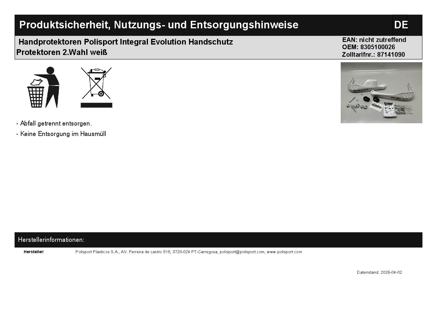 In dieser Auktion gibt es folgenden Artikel zu kaufen: Handguards + Befestigungskit, 2.Wahl (ähnlich Foto) ggf. unvollständig bitte Bilder prüfen! Hersteller: Polisport Integral Evolution Lieferumfang: Handguards mit Befestigungskit für Lenkeraußendurchmesser von 22 mm und Bohrungsdurchmesser (am Lenkerende) zwischen 14 - 18 mm Hinweis: Für Lenker von Magura oder Protaper benötigen Sie aufgrund anderer Durchmesser andere Befestigungssätze als den mitgelieferten Satz. Artikelzustand: neu aus einer Retoure, mit Anbauspuren wie Kratzer etc; Zustand ähnlich Foto Bei Unklarheiten oder Fragen bitte erst E-Mail schreiben.