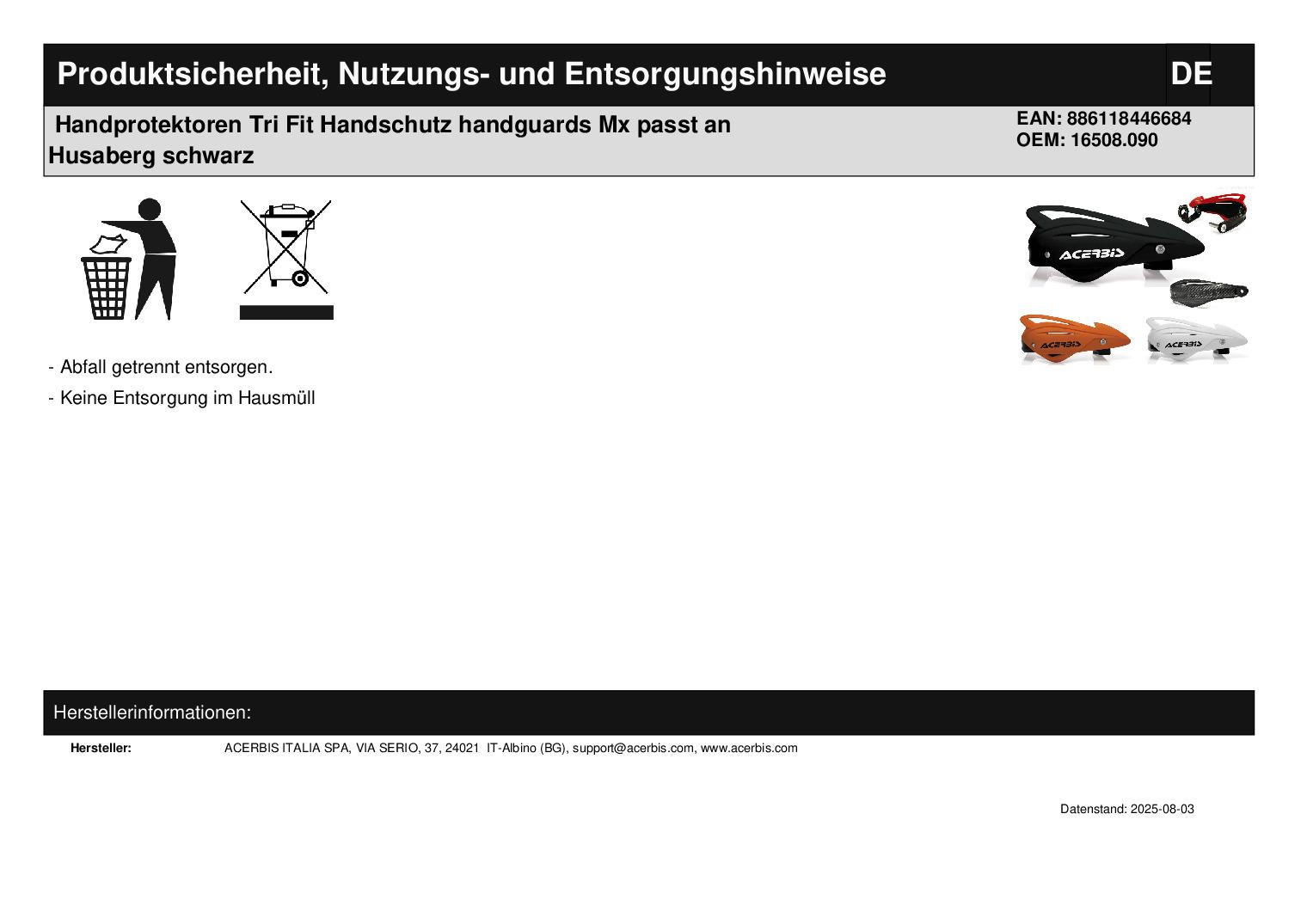 In dieser Auktion gibt es folgenden Artikel zu kaufen: Handguards (siehe Foto) Hersteller: Acerbis Paramano Tri Fit Artikelbeschreibung: Dieser innovative, multifunktionale Handschutz-Kit ermöglicht vier verschiedene Anbaumöglichkeiten: 1. MX-Handbügel 2. MX-Handschutz offen 3. ATV-Montage nur am äußeren Lenkerende 4. Handbügel geschlossen, ohne Plastik Montage möglich an : Motocross, Enduro, Motorrad und ATV; Aluminium-Lenker mit einem Innendurchmesser von min. 13,6 mm - max. 14,6 mm Material: Nylon Lieferumfang: - Handschutz, Paar - Montagekit Artikelzustand: neu Bei Unklarheiten oder Fragen bitte erst E-Mail schreiben.