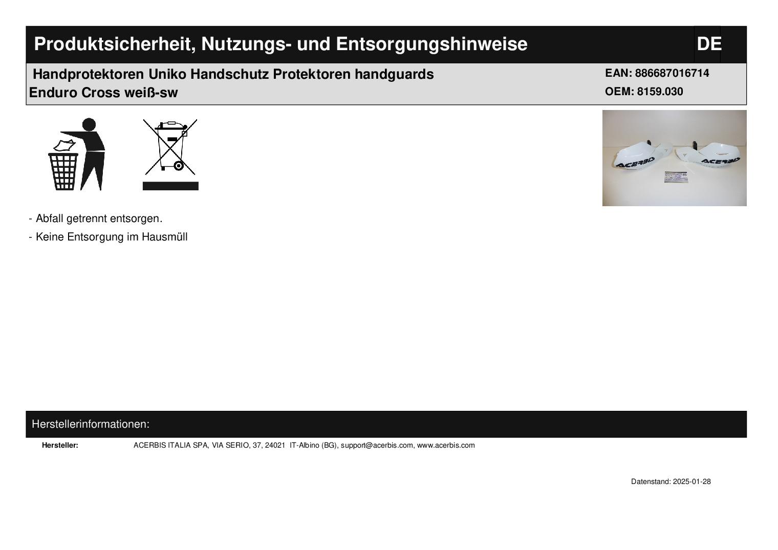 In dieser Auktion gibt es folgenden Artikel zu kaufen: Handschutz (siehe Foto) Hersteller: Acerbis Uniko Farbe: weiß mit schwarzer Schrift Lieferumfang: 1 Satz links + rechts mit AnbaukitArtikelbeschreibung: passend für sämtliche Enduros, Crosser, Roller, Quads, ATV´s usw. mit einem Lenkerdurchmesser von mindestens Ø 22 mm! Artikelzustand: neu Bei Unklarheiten oder Fragen bitte erst E-Mail schreiben.