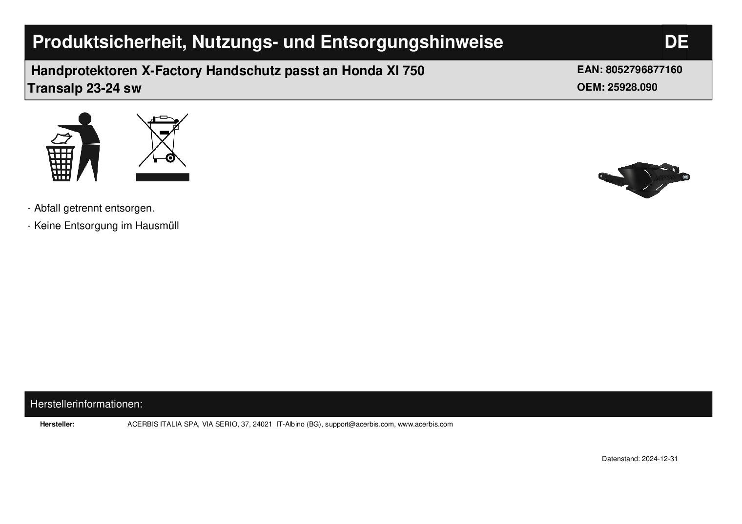 In dieser Auktion gibt es folgenden Artikel zu kaufen: Handprotektoren inkl. Anbauteile (ähnlich Foto) Fahrzeug: passend für Honda XL 750 Transalp Bj.: 2023 - 2025 passen selbstverständlich auch für andere Enduros und Crosser; bitte Abmaße siehe unten vergleichen! Artikelbeschreibung: - geschlossene Handschale - Stahlbügel in verschiedenen Farben überspritzt - Befestigungsklemmen in Anticorodal - Expander aus Stahl für bessere Befestigung und Gewährleistung eines höheren Verdrehungswiderstands - Cover mit Zweifach-Einspritzung Abmaße: für Lenker mit Innendurchmesser 13,5 - 16 mm und Außendurchmesser 22 - 28 mm Material: Cover: 85% Polypropylen, 15 % Gummi (TPE) Bügel: 80 % Stahl, 20 % Polypropylen Lieferumfang: siehe Foto Artikelzustand: neu Hierbei handelt es sich um kein Originalteil! Bei Unklarheiten oder Fragen bitte erst E-Mail schreiben.