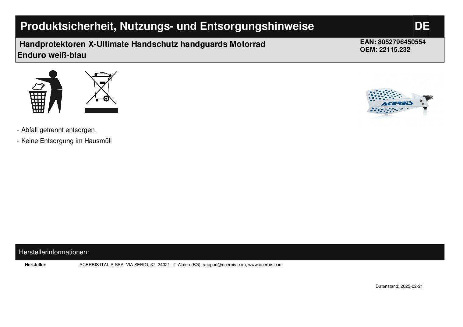In dieser Auktion gibt es folgenden Artikel zu kaufen: Handprotektoren (siehe Foto) Hersteller: Acerbis X-Ultimate Artikelbeschreibung: - offener Handschutz zur universellen Montage - maximaler Schutz der Hände und der Armaturen - Halterung aus Nylon - kleine Abdeckungen oben und unten abnehmbar für eine höchstmögliche Belüftung - hergestellt aus Thermoplastik: leicht, kompakt, bruchsicher - einfache Montage ohne Demontage der Armaturen - horizontal verstellbar - für Lenker mit Außendurchmesser von Ø 22 - 28 mm und Twinwall - inklusive Anbaukit Lieferumfang: Handschützer mit universalem Anbausatz Artikelzustand: neu Bei Unklarheiten oder Fragen bitte erst E-Mail schreiben.