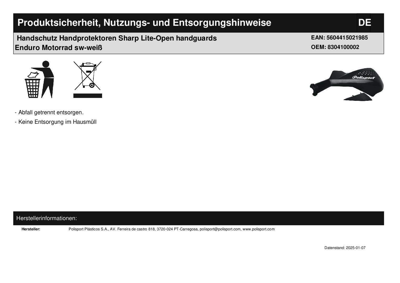 In dieser Auktion gibt es folgenden Artikel zu kaufen: Handguards + Befestigungskit, 2. Wahl (ähnlich Foto) Hersteller: Polisport Sharp Lite-Open Artikelbeschreibung: Handguards mit Befestigungskit für diverse Lenkeraußendurchmesser universelles Handprotektorenpaar Sharp Lite; produziert mit DGP (Durable Gloss Polypropylene) Diese Kunststoff-Komposition ermöglicht ein Maximum an Glanz und Stabilität. - geeignet für Enduro, ATV - einfache Montage (direkt am Lenker) - für Lenker mit einem Außendurchmesser von 22 - 26 mm - hohe Schlagfestigkeit - integrierte Belüftungslöcher - separate Abdeckung zum Schließen der Belüftungslöcher (im Lieferumfang enthalten) - inklusive Befestigungssatz Lieferumfang: Handguards mit Befestigungskit für diverse Lenkeraußendurchmesser Artikelzustand: Retoureartikel mit leichten Lagerspuren, 2. Wahl; Zustand ähnlich Foto Hierbei handelt es sich um kein Originalteil! Bei Unklarheiten oder Fragen bitte erst E-Mail schreiben.