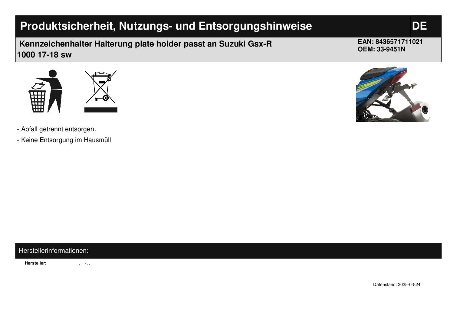 In dieser Auktion gibt es folgenden Artikel zu kaufen: Kennzeichenhalter ohne Blinker (ähnlich Foto) Modell: passend für Suzuki GSX-R 1000 Bj.: 2017 - 2018 Lieferumfang: Kennzeichenhalter ohne Blinker Artikelzustand: neu Hierbei handelt es sich um kein Originalteil Bei Unklarheiten oder Fragen bitte erst E-Mail schreiben.