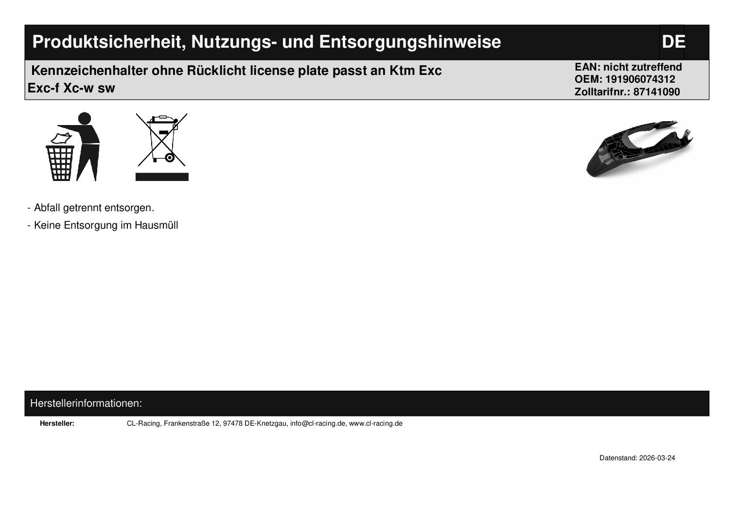 Titel: Kennzeichenhalter ohne Rücklicht license plate passt an Ktm Exc Exc-f Xc-w sw