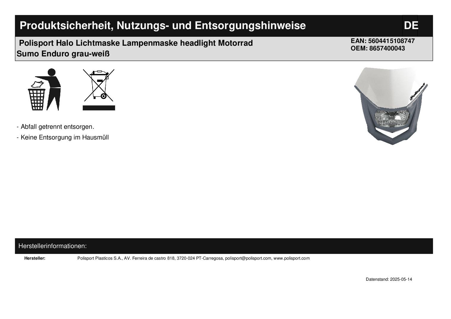 In dieser Auktion gibt es folgenden Artikel zu kaufen: Lichtmaske incl. Anbaukit und Leuchtmittel (ähnlich Foto, nur in grau -weiß) Hersteller: Polisport Halo Artikelbeschreibung: Es handelt sich hier um eine universal einsetzbare Lichtmaske, d. h. es kann sein, dass kleinere Veränderungen am Fahrzeug nötig sind, um das Teil zu montieren! universelle Scheinwerfermaske Halo; produziert mit DGP (Durable Gloss Polypropylene) Diese Kunststoff-Komposition ermöglicht ein Maximum an Glanz und Stabilität. - erfüllt ECE-, SAE- und DOT-Standards - Lampen : 1 x 12 V 35/35 W Halogen (HS1; Sockel BA20d) für Fern- und Abblendlicht und 1 x 12 V 5 W (W5W; Sockel BA9s) für Standlicht - universelles Befestigungssystem - hitzebeständiges Plastik - Klarglas-Optik - inklusive Haltegummis - inklusive Halterung für Lampenmaske (erhöht die Distanz zwischen Maske und Gabel zwischen 20 und 40 mm) Farbe: grau-weiß Lieferumfang: 1 Stück Artikelzustand: neu Bei Unklarheiten oder Fragen bitte erst E-Mail schreiben.