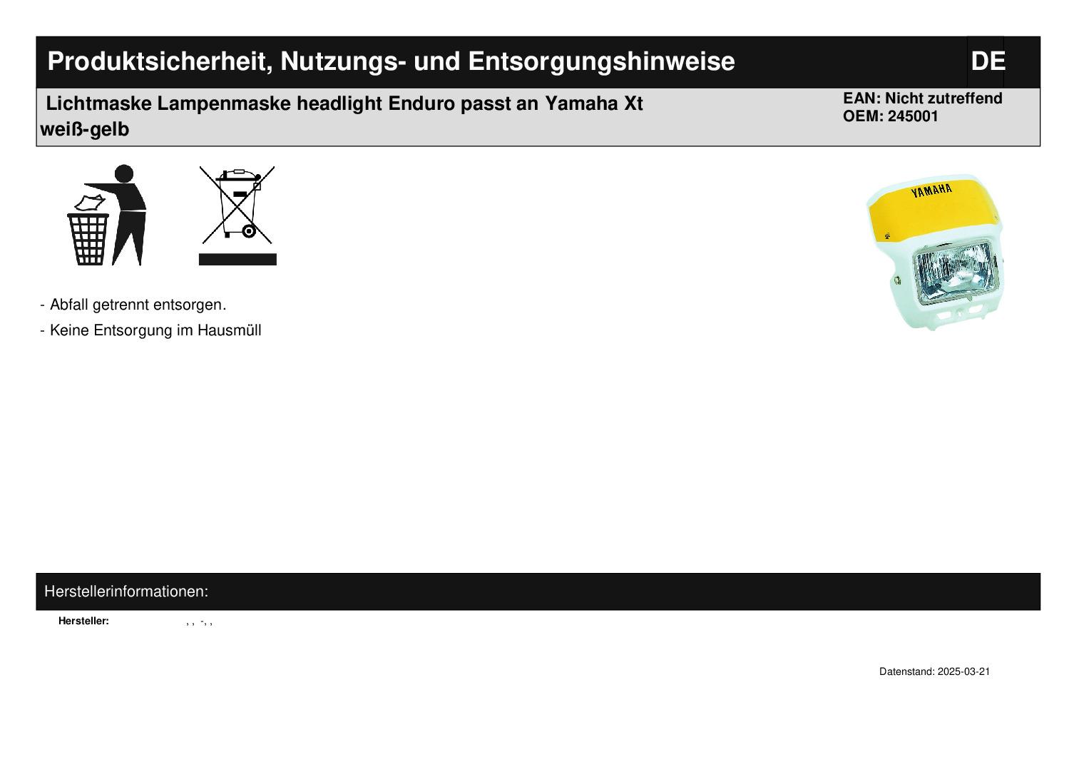 In dieser Auktion gibt es folgenden Artikel zu kaufen: Lichtmaske incl. Anbaukit und Leuchtmittel (siehe Foto) Modell: passend für Yamaha XT Bj.: unbekannt Details: Lichtmaske insgesamt: ca. 26,5 cm breit x 29,5 cm hoch Bitte Abmaße vor dem Kauf prüfen! E-Zeichen: nein Lieferumfang: siehe Foto Artikelzustand: neu Bei Unklarheiten oder Fragen bitte erst E-Mail schreiben.