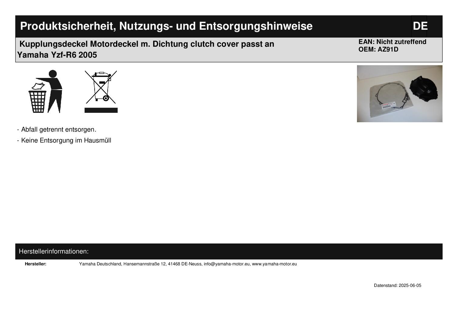 In dieser Auktion gibt es folgenden Artikel zu kaufen: Motordeckel mit Dichtung (siehe Foto) Fahrzeug: passend für Yamaha YZF-R6 Bj.: 05 Teilenummer: AZ91D (steht auf der Innenseite des Deckels) Lieferumfang: siehe Foto Artikelzustand: neu aus Geschäftsauflösung, mit minimalen Lagerspuren; Zustand siehe Foto Bei Unklarheiten oder Fragen bitte erst E-Mail schreiben.