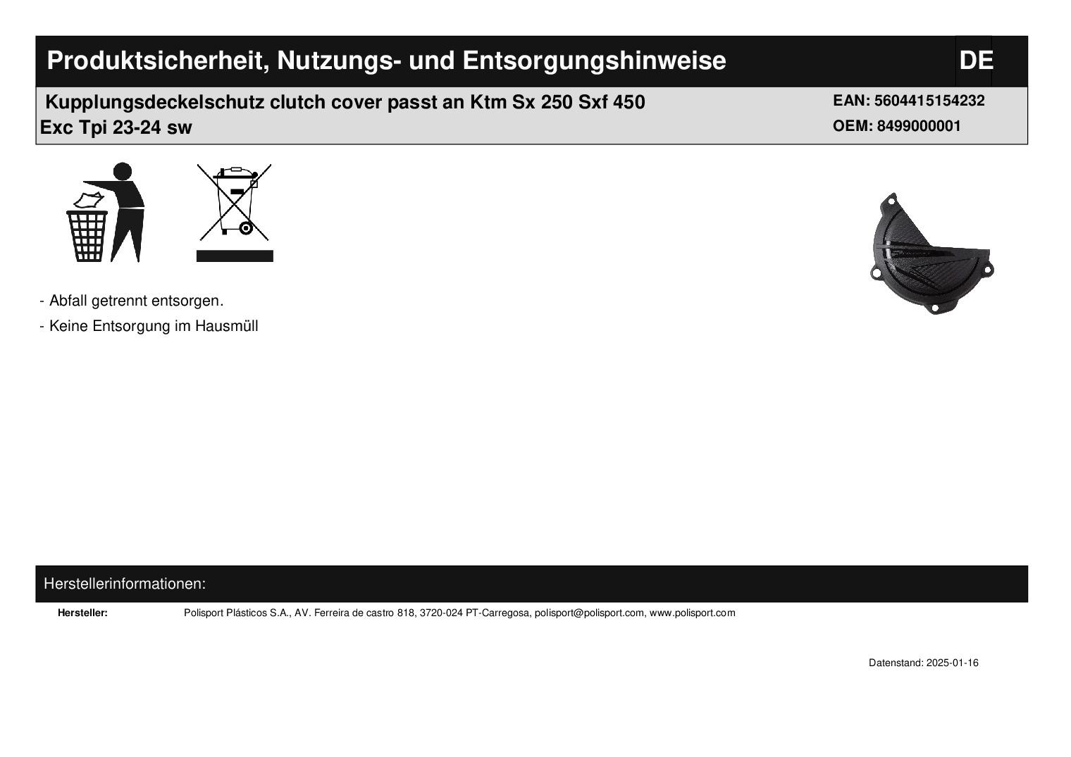 In dieser Auktion gibt es folgenden Artikel zu kaufen: Kupplungsdeckelschutz (ähnlich Foto) Modell: passend für KTM EXC 250 TPI, 300 TPI Bj.: 24 - 25 SMR 450 Bj.: 23 - 25 SX 250, 300 Bj.: 23 - 25 SXF 250, 350, 450 Bj.: 23 - 25 passend für Husqvarna FC 250, 350, 450 Bj.: 23 - 25 TC 250 Bj.: 23 - 25 TE i 250, 300 Bj.: 24 - 25 Lieferumfang: siehe Foto Artikelzustand: neu Hierbei handelt es sich um kein Originalteil! Bei Unklarheiten oder Fragen bitte erst E-Mail schreiben.