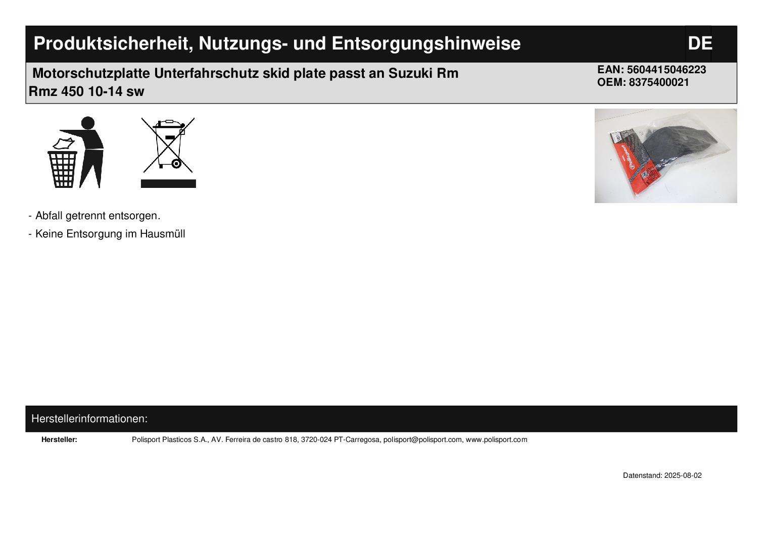 In dieser Auktion gibt es folgenden Artikel zu kaufen: Motorschutzplatte (siehe Foto) Modell: passend für Suzuki RMZ 450 Bj.: 2010 - 2014 (4-Takt) Lieferumfang: Motorschutz mit Anbauteilen und Anbauanleitung Artikelzustand: neu Bei Unklarheiten oder Fragen bitte erst E-Mail schreiben.