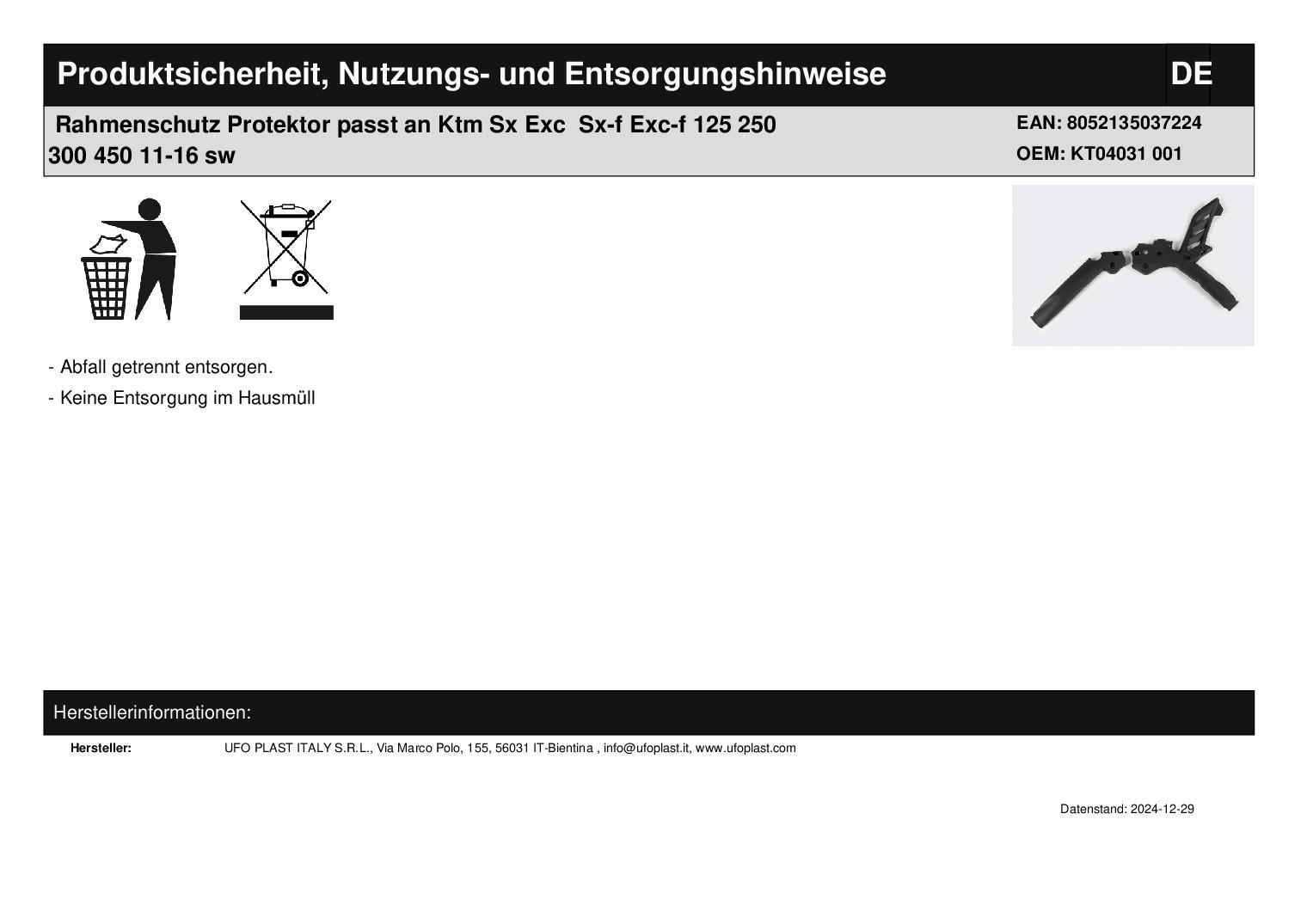 In dieser Auktion gibt es folgenden Artikel zu kaufen: Rahmenschutz (siehe Foto) Fahrzeug: passend für Ktm SX 125, 150 Bj.: 2011 - 2015SX 250 Bj.: 2011 - 2016 SXF 250, 350, 450 Bj.: 2011 - 2015 EXC 125, 200, 250, 300 Bj.: 2012 - 2016 EXC-F 350, 450, 500 Bj.: 2012 - 2016 Lieferumfang: siehe Foto Artikelzustand: neu Bei Unklarheiten oder Fragen bitte erst E-Mail schreiben. Es handelt sich hierbei um kein Originalteil
