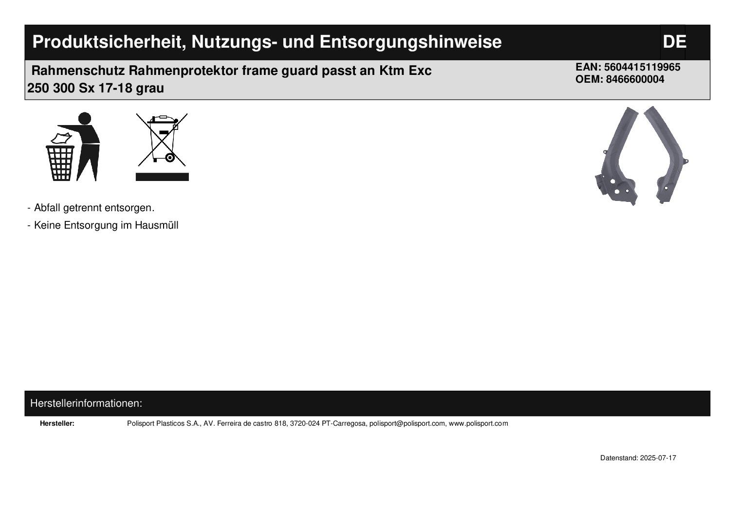In dieser Auktion gibt es folgenden Artikel zu kaufen: Rahmenschutz (ähnlich Foto) Modell: passend für KTM EXC 125, 200 Bj.: 2017 - 2019EXC 250, 300 Bj.: 2017 - 2018 EXC TPI 250, 300 Bj.: 2018 - 2019 EXC-F 250, 350, 450, 500 Bj.: 2017 - 2019 SX 125, 150 Bj.: 2016 - 2018 SX 250 Bj.: 2017 - 2018 SXF 250, 350, 450 Bj.: 2016 - 2018 SXF 505 Bj.: 2016 - 2017 XC 250, 300 Bj.: 2017 - 2019 XC-F 250, 350, 450 Bj.: 2016 - 2019 passend für Husqvarna FC 250, 350, 450 Bj.: 2016 - 2018 FE 250, 350, 450, 501 Bj.: 2017 - 2019 FX 350, 450 Bj.: 2017 - 2019 TC 125 Bj.: 2016 - 2018 TC 250 Bj.: 2017 - 2018 TE 125 Bj.: 2017 - 2019 TE 250 Bj.: 2017 - 2018 TE 300 Bj.: 2017 - 2018 TE i 250, 300 Bj.: 2018 - 2019 TX 125, 300 Bj.: 2017 - 2018 Lieferumfang: siehe Foto Artikelzustand: neu Hierbei handelt es sich um kein Originalteil! Bei Unklarheiten oder Fragen bitte erst E-Mail schreiben.