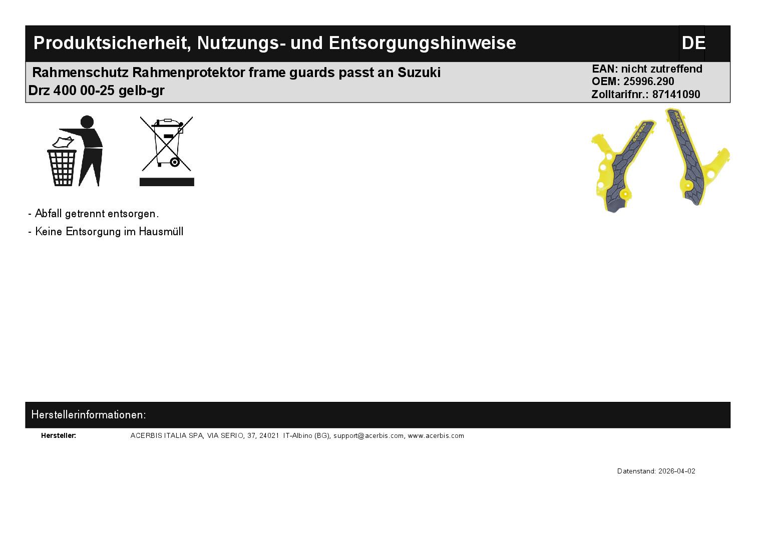 Titel: Rahmenschutz Rahmenprotektor frame guards passt an Suzuki Drz 400 00-25 gelb-gr