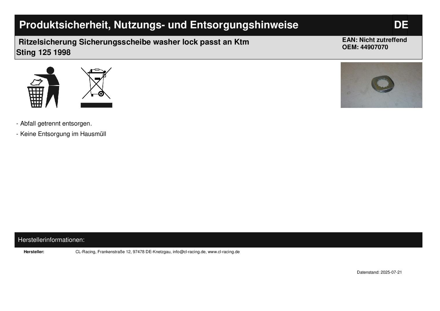 In dieser Auktion gibt es folgenden Artikel zu kaufen: Sicherungsscheibe (siehe Foto) Modell: passend für Ktm Sting 125 Bj.: 1998 Lieferumfang: siehe Foto Artikelzustand: neu aus Geschäftsauflösung, mit minimalen Lagerspuren; Zustand siehe Foto Es handelt sich hierbei um kein Originalteil Bei Unklarheiten oder Fragen bitte erst E-Mail schreiben.