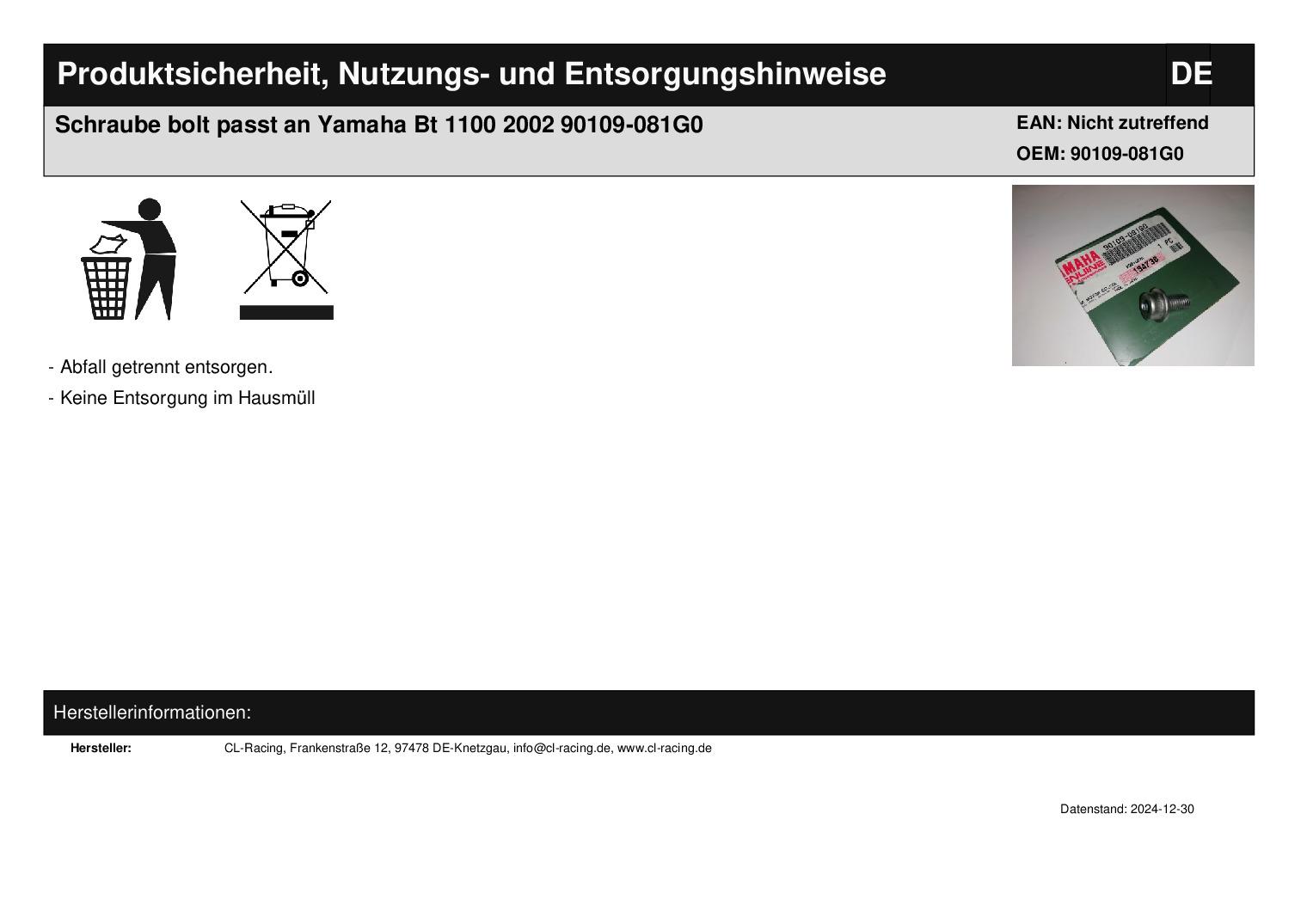 In dieser Auktion gibt es folgenden Artikel zu kaufen: Schraube (siehe Foto) Modell: passend für Yamaha BT 1100 Bj.: 2002 Lieferumfang: 1 Stück Artikelzustand: neu aus Geschäftsauflösung, mit minimalen Lagerspuren; Zustand siehe Foto Bei Unklarheiten oder Fragen bitte erst E-Mail schreiben.