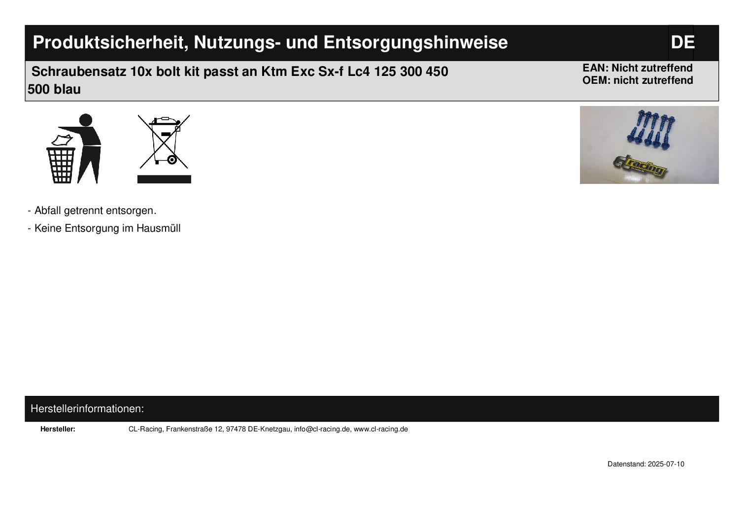 Titel: Schraubensatz 10x bolt kit passt an Ktm Exc Sx-f Lc4 125 300 450 500 blau