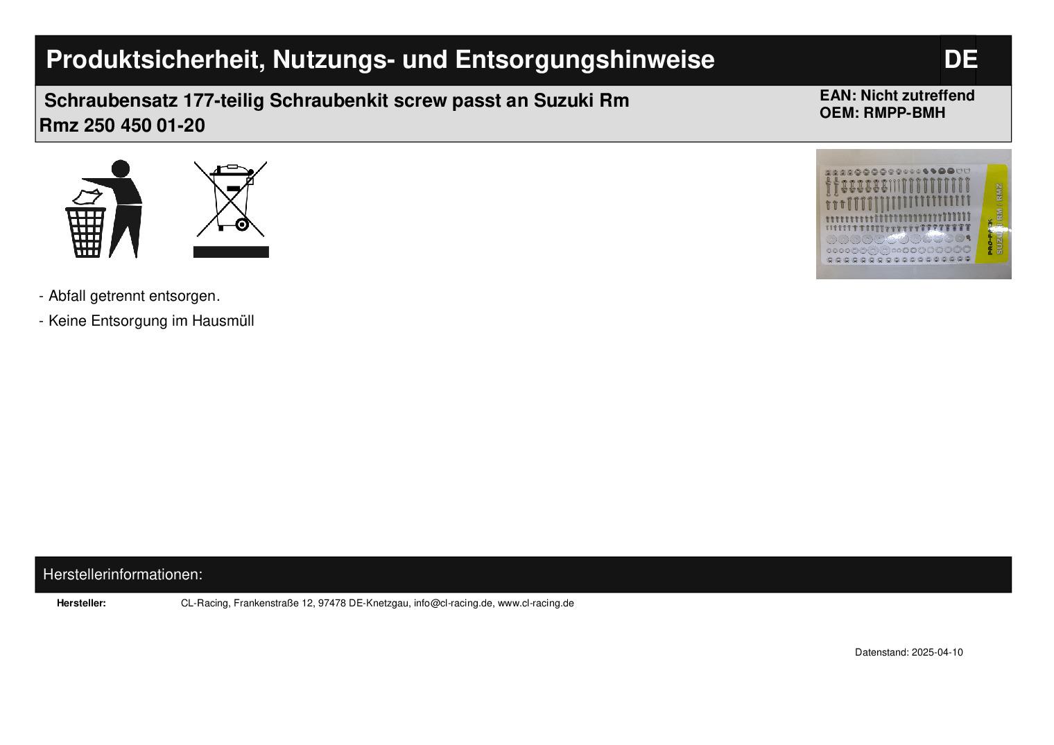 In dieser Auktion gibt es folgenden Artikel zu kaufen: 177-teiliger Schraubensatz in Top-Qualität (siehe Foto) Fahrzeug: passend für Suzuki RM, RMZ Bj.: 2001 - 2020 Details: diverse Schrauben, Splinte, Scheiben usw.; alles in einer gut sortierten Kunststoffbox Lieferumfang: 177 Teile Artikelzustand: neu Bei Unklarheiten oder Fragen bitte erst E-Mail schreiben.