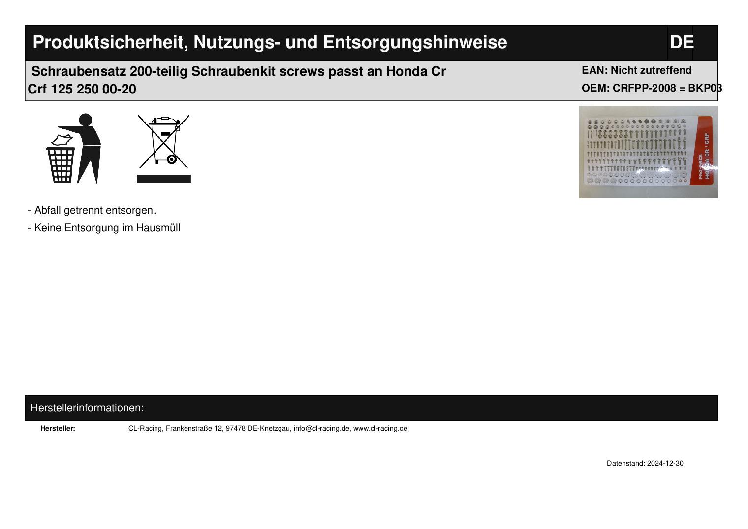 In dieser Auktion gibt es folgenden Artikel zu kaufen: 200-teiliger Schraubensatz in Top-Qualität (siehe Foto) Fahrzeug: passend für Honda CR, CRF Bj.: 2000 - 2020 Details: diverse Schrauben, Splinte, Scheiben usw.; alles in einer gut sortierten Kunststoffbox Lieferumfang: 200 Teile Artikelzustand: neu Bei Unklarheiten oder Fragen bitte erst E-Mail schreiben.