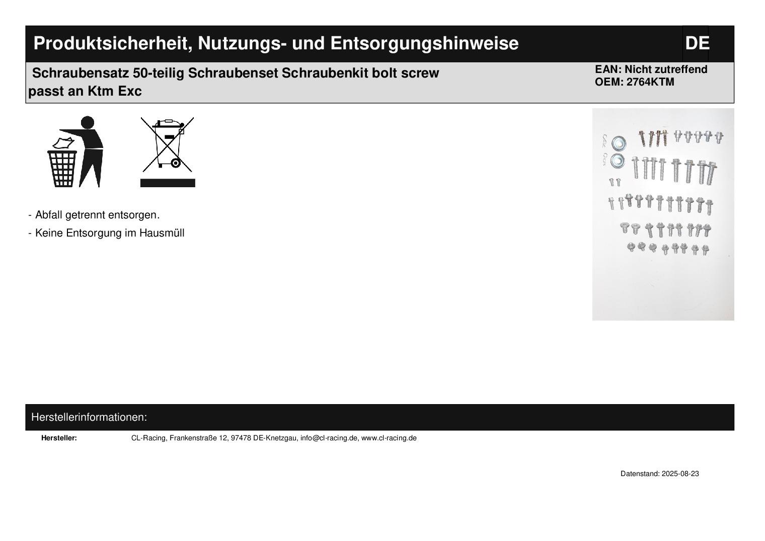 In dieser Auktion gibt es folgenden Artikel zu kaufen: 50-teiliger Schraubensatz in Top-Qualität (siehe Foto) Fahrzeug: passend für Ktm Bj.: --- passend für Husaberg Bj.: --- passend für Husqvarna Bj.: --- Lieferumfang: 50 Teile diverse Schrauben, Splinte, Scheiben usw.; alles in einer gut sortierten Kunststoffbox Artikelzustand: neu Es handelt sich hierbei um kein Originalteil! Bei Unklarheiten oder Fragen bitte erst E-Mail schreiben.