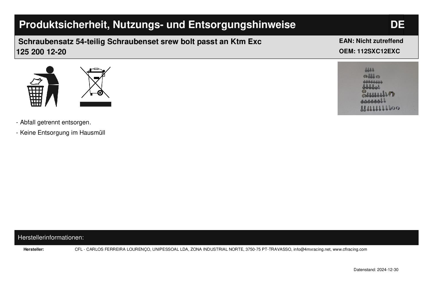 In dieser Auktion gibt es folgenden Artikel zu kaufen: 54-teiliger Schraubensatz in Top-Qualität (siehe Foto) Modell: passend für KTM EXC 125 Bj.: 12 - 20 EXC 200 Bj.: 12 - 20 EXC 250 Bj.: 12 - 20 EXC 500 Bj.: 12 - 20 SX 65 Bj.: 11 - 14 SX 85 Bj.: 11 - 14 SX 150 Bj.: 11 - 14 SX 250 Bj.: 11 - 14 Artikelbeschreibung: diverse Schrauben, Splinte, Scheiben usw.; alles in einer gut sortierten Kunststoffbox Lieferumfang: 54 Teile Artikelzustand: neu Hierbei handelt es sich um kein Originalteil Bei Unklarheiten oder Fragen bitte erst E-Mail schreiben.