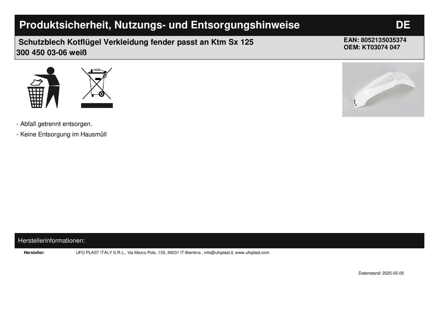 In dieser Auktion gibt es folgenden Artikel zu kaufen: Schutzblech vorne (siehe Foto) Fahrzeug: passend für Ktm SX 125 200 300 450 520 525 Bj.: 03 - 06 SX-F Bj.: 05 - 06 EXC Bj.: 03 - 07 EXC-F Bj.: 06 - 07 Lieferumfang: siehe Foto Artikelzustand: neu Es handelt sich hierbei um kein Originalteil Bei Unklarheiten oder Fragen bitte erst E-Mail schreiben.
