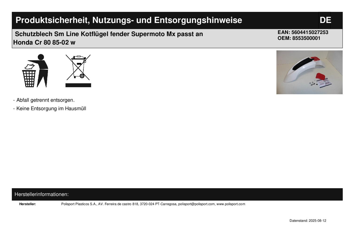 Titel: Schutzblech Sm Line Kotflügel fender Supermoto Mx passt an Honda Cr 80 85-02 w