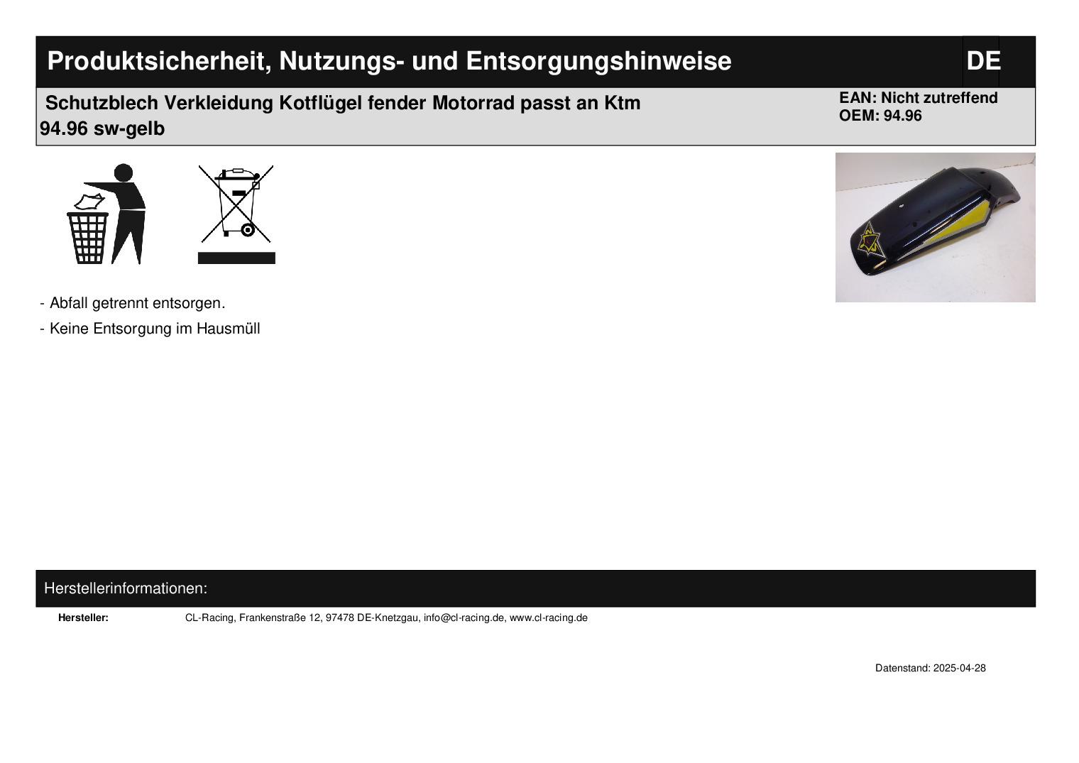 In dieser Auktion gibt es folgenden Artikel zu kaufen: Schutzblech (siehe Foto) Modell: passend für Ktm Details: "94.96" steht auf der Innenseite des Schutzblechs Abmaße: Breite gesamt ca. 24 cm Lieferumfang: siehe Foto Artikelzustand: normale Gebrauchsspuren wie Kratzer und Abschürfungen vorhanden; Löcher teilweise aufgebohrt; Aufkleber kleben nicht mehr richtig; Zustand siehe Foto