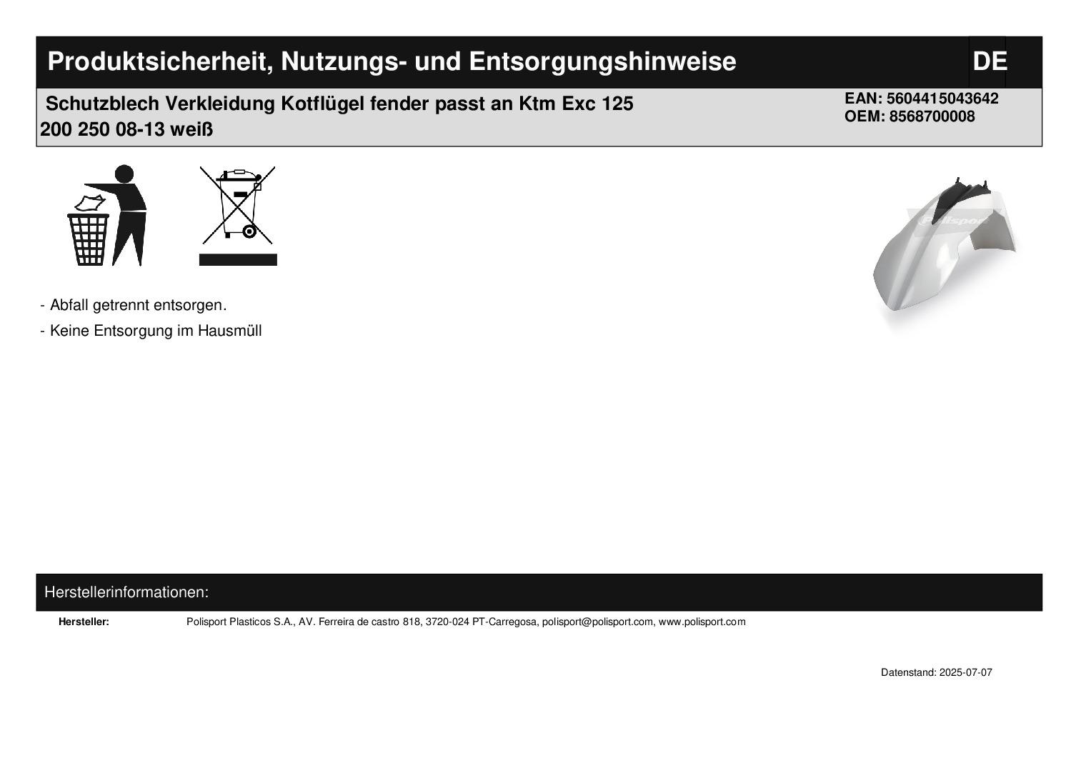 Polisport Schutzblech vorne Ktm Sx Exc Bj.: 07-13 weiß/schwarz - Lager -