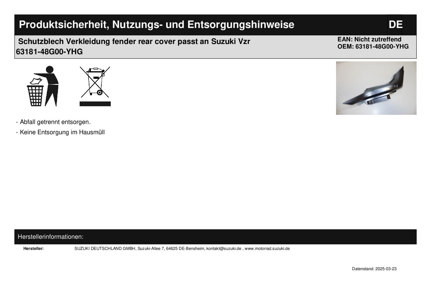 In dieser Auktion gibt es folgenden Artikel zu kaufen: Schutzblech hinten (siehe Foto) Modell: passend für Suzuki VZR 1800 Bj.: 06 - 15 Lieferumfang: siehe Foto Artikelzustand: neu aus Geschäftsauflösung, mit minimalen Lagerspuren, Zustand siehe Fotos