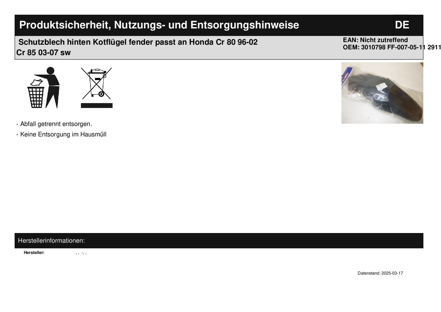 In dieser Auktion gibt es folgenden Artikel zu kaufen: Schutzblech (siehe Foto) Fahrzeug: passend für Honda CR 80 Bj.: 96 - 02 CR 85 Bj.: 03 - 07 Lieferumfang: siehe Foto Artikelzustand: neu aus Geschäftsauflösung, mit leichten Lagerspuren; Zustand siehe Foto Bei Unklarheiten oder Fragen bitte erst E-Mail schreiben.