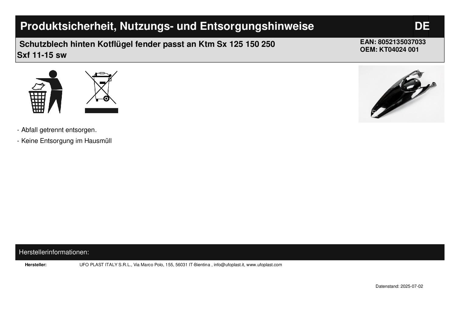 In dieser Auktion gibt es folgenden Artikel zu kaufen: Schutzblech (siehe Foto) Fahrzeug: passend für Ktm SX 125, 150, 250 Bj.: 2011- 2016 SX-F 250, 350, 450 Bj.: 2011 - 2015 Lieferumfang: siehe Foto Artikelzustand: neu Es handelt sich hierbei um kein Originalteil Bei Unklarheiten oder Fragen bitte erst E-Mail schreiben.