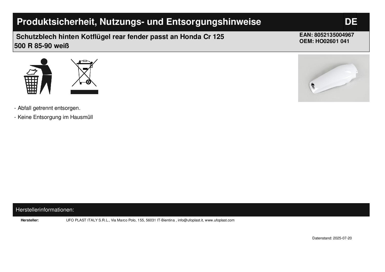 In dieser Auktion gibt es folgenden Artikel zu kaufen: Schutzblech (siehe Foto) Fahrzeug: passend für Honda CR 125 R, 500 R Bj.: 85 - 90 CR 250 R Bj.: 85 - 89 Lieferumfang: siehe Foto Artikelzustand: neu Bei Unklarheiten oder Fragen bitte erst E-Mail schreiben.