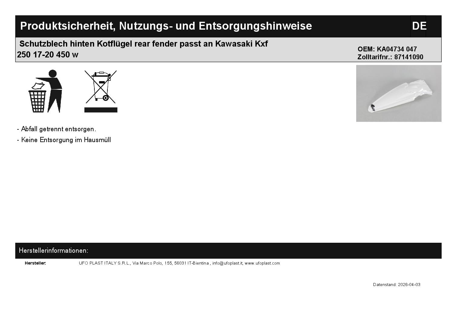 Titel: Schutzblech hinten Kotflügel rear fender passt an Kawasaki Kxf 250 17-20 450 w