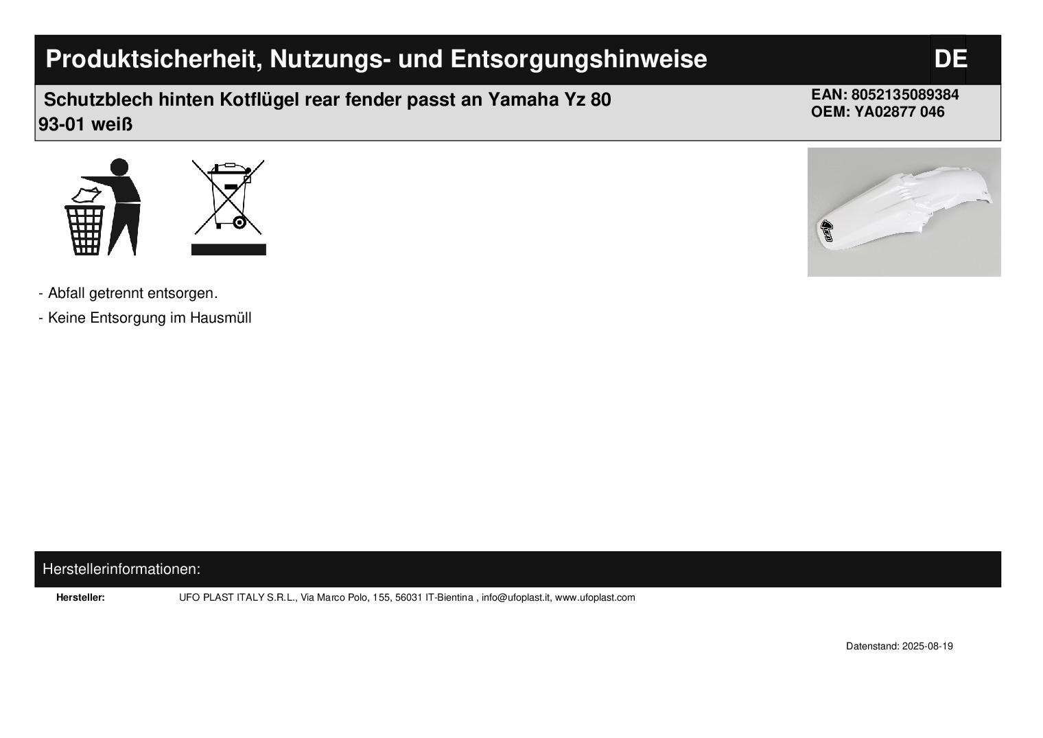 Titel: Schutzblech hinten Kotflügel rear fender passt an Yamaha Yz 80 93-01 weiß