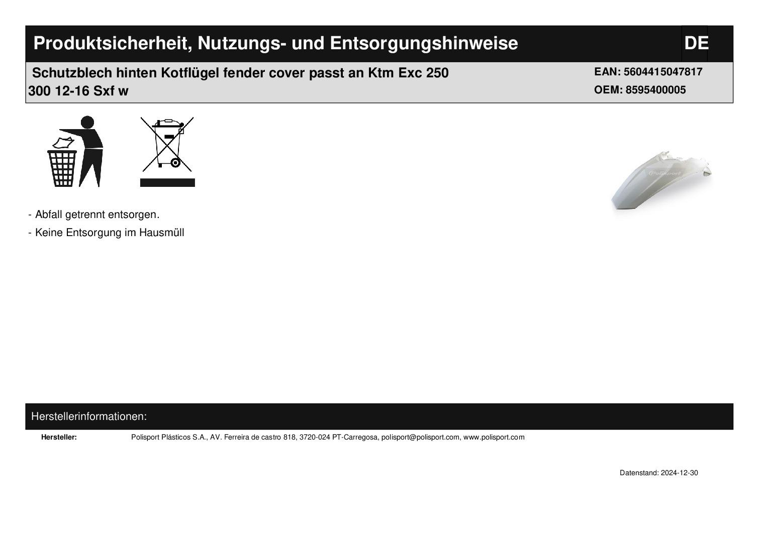 In dieser Auktion gibt es folgenden Artikel zu kaufen: Schutzblech hinten (siehe Foto) Fahrzeug: passend für Ktm EXC 125 Bj.: 2012 - 2016 (2-Takt) EXC 200 Bj.: 2012 - 2016 (2-Takt) EXC 250 Bj.: 2012 - 2016 (2-Takt) EXC 300 Bj.: 2012 - 2016 (2-Takt) EXC-F 250 Bj.: 2012 - 2016 (4-Takt) EXC-F 350 Bj.: 2012 - 2016 (4-Takt) EXC-F 450 Bj.: 2012 - 2016 (4-Takt) EXC-F 500 Bj.: 2012 - 2016 (4-Takt) SX 125 Bj.: 2011 - 2015 (2-Takt) SX 150 Bj.: 2011 - 2015 (2-Takt) SX 250 Bj.: 2011 - 2016 (2-Takt) SX-F 250 Bj.: 2011 - 2015 (4-Takt) SX-F 350 Bj.: 2011 - 2015 (4-Takt) SX-F 450 Bj.: 2011 - 2015 (4-Takt) XC 150 Bj.: 2011 - 2015 (2-Takt) XC 250 Bj.: 2011 - 2016 (2-Takt) XC 300 Bj.: 2011 - 2016 (2-Takt) XCF 250 Bj.: 2011 - 2015 (4-Takt) XCF 350 Bj.: 2011 - 2015 (4-Takt) XCF 450 Bj.: 2013 - 2015 (4-Takt) Lieferumfang: siehe Foto Artikelzustand: neu Es handelt sich hierbei um kein Originalteil Bei Unklarheiten oder Fragen bitte erst E-Mail schreiben.