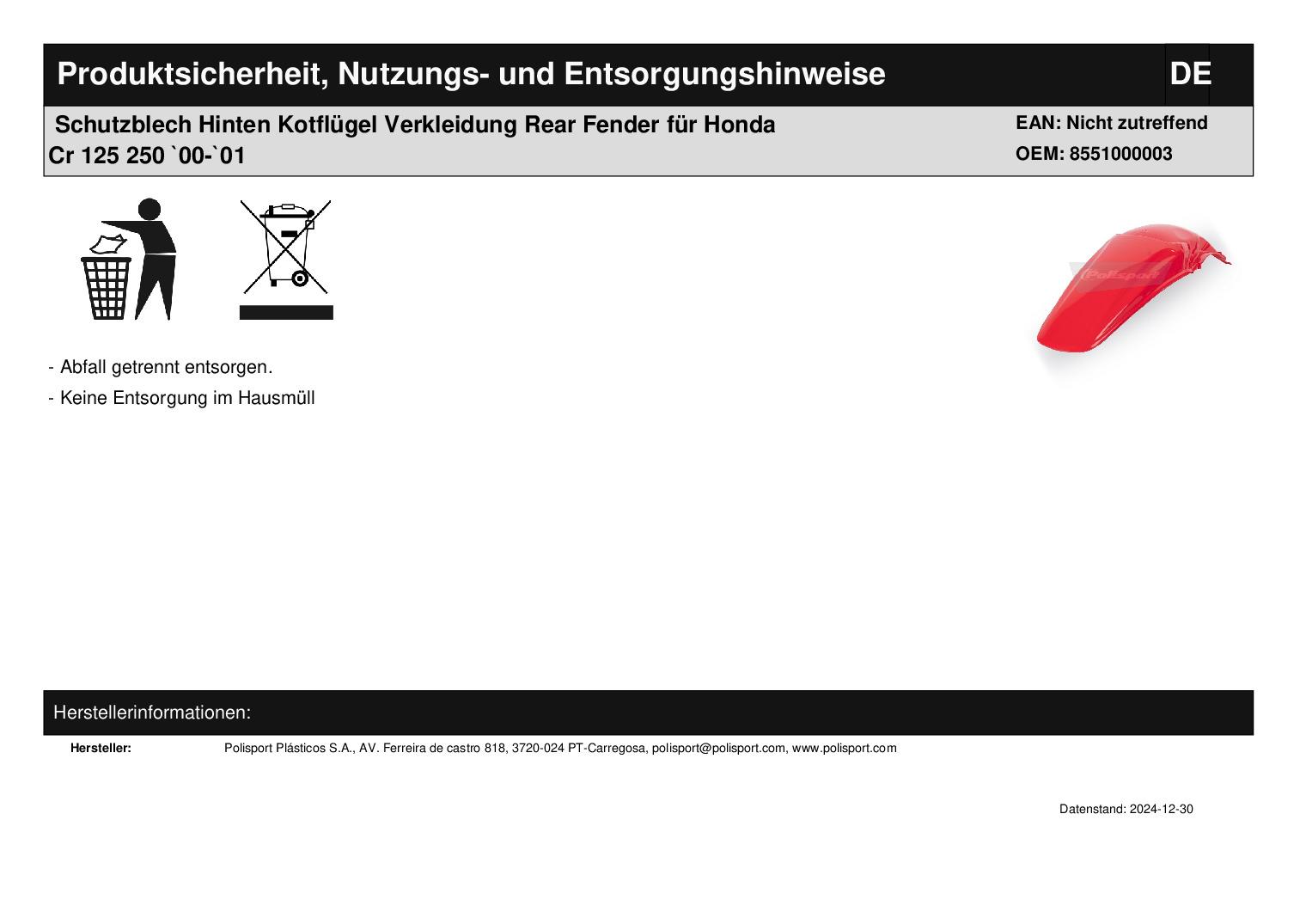 Schutzblech hinten Kotflügel rear fender passt an Honda Cr 250 125 00-01 rot