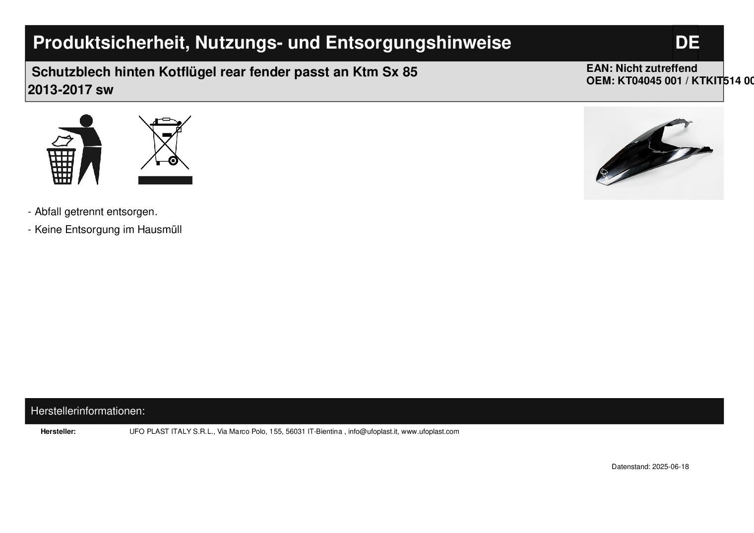 In dieser Auktion gibt es folgenden Artikel zu kaufen: Schutzblech (siehe Foto) Fahrzeug: passend für Ktm Sx 85 Bj.: 13 - 17 (2-Takt) Lieferumfang: siehe Foto Artikelzustand: neu aus Geschäftsauflösung, mit minimalen Lagerspuren; Zustand siehe Foto Es handelt sich hierbei um kein Originalteil Bei Unklarheiten oder Fragen bitte erst E-Mail schreiben.