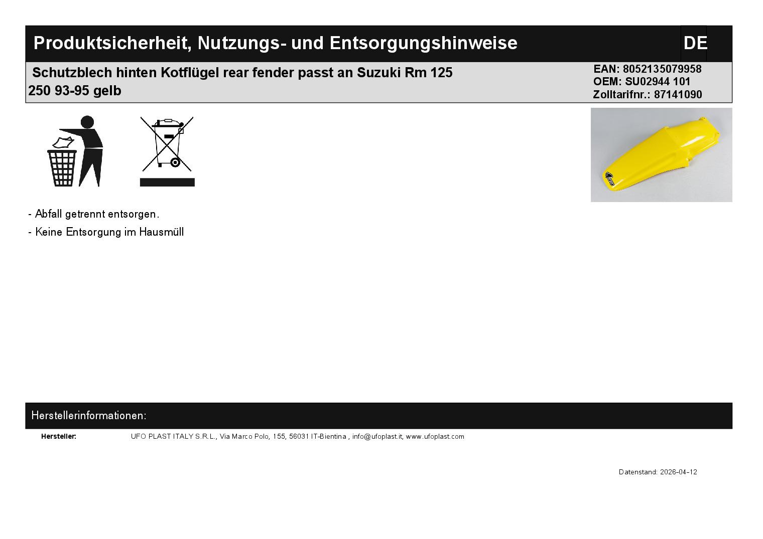 Titel: Schutzblech hinten Kotflügel rear fender passt an Suzuki Rm 125 250 93-95 gelb