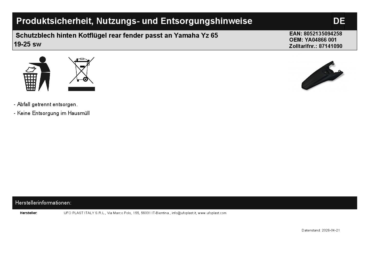 Titel: Schutzblech hinten Kotflügel rear fender passt an Yamaha Yz 65 19-25 sw