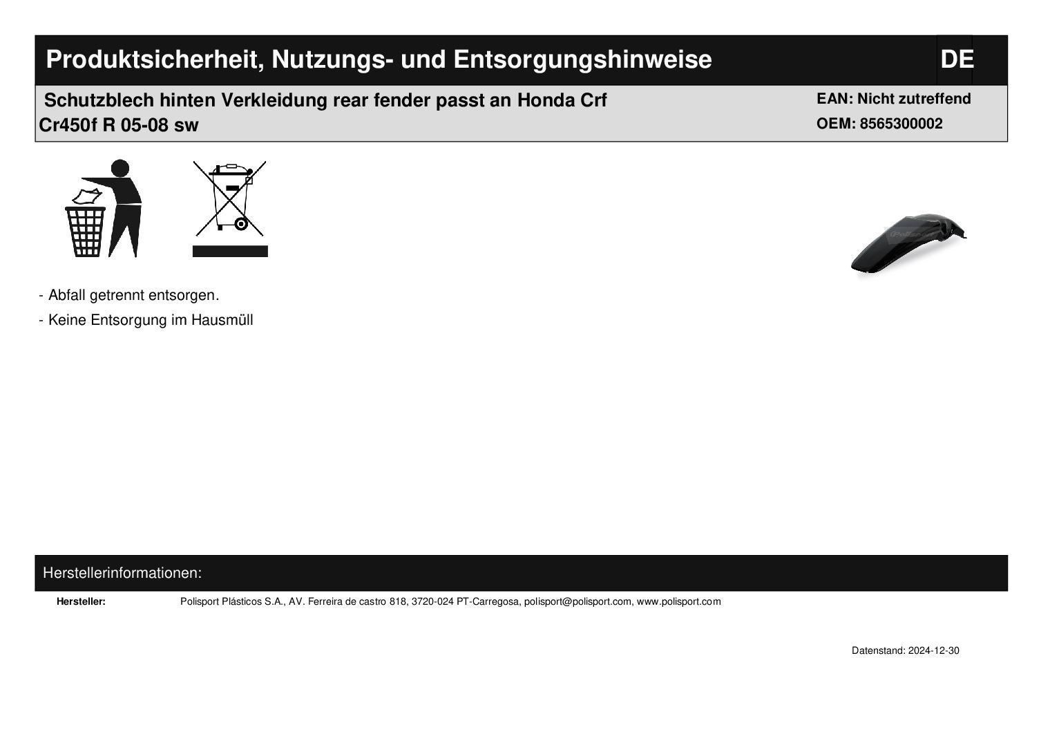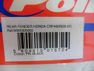 In dieser Auktion gibt es folgenden Artikel zu kaufen Schutzblech hinten (siehe Foto) Fahrzeug: passend für Honda Crf 450 R (4-Takt) Bj.: 2005 - 2008 Lieferumfang: siehe Foto Artikelzustand: neu aus Geschäftsauflösung, mit leichten Lagerspuren; Zustand siehe Foto Bei Unklarheiten oder Fragen bitte erst E-Mail schreiben.