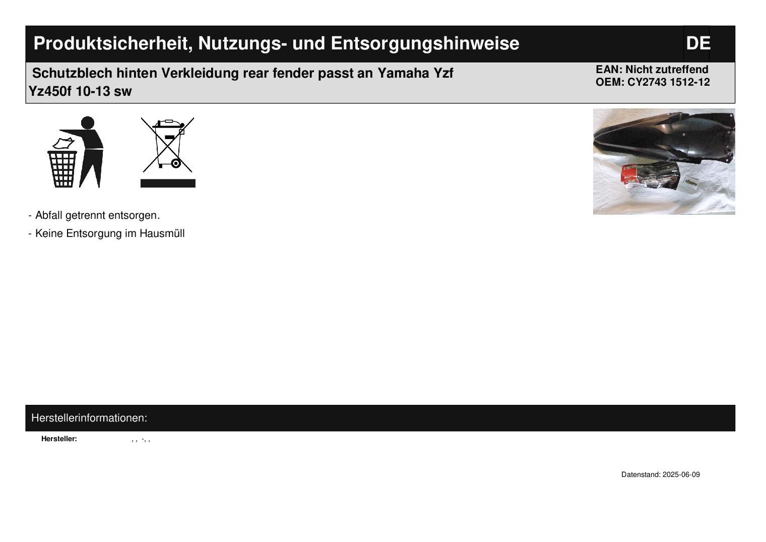 In dieser Auktion gibt es folgenden Artikel zu kaufen: Schutzblech hinten (siehe Foto) Modell: passend für Yamaha YZF 450 Bj.: 10 - 13 Lieferumfang: siehe Foto Artikelzustand: neu aus Geschäftsauflösung, mit leichten Lagerspuren; Zustand siehe Foto Bei Unklarheiten oder Fragen bitte erst E-Mail schreiben.
