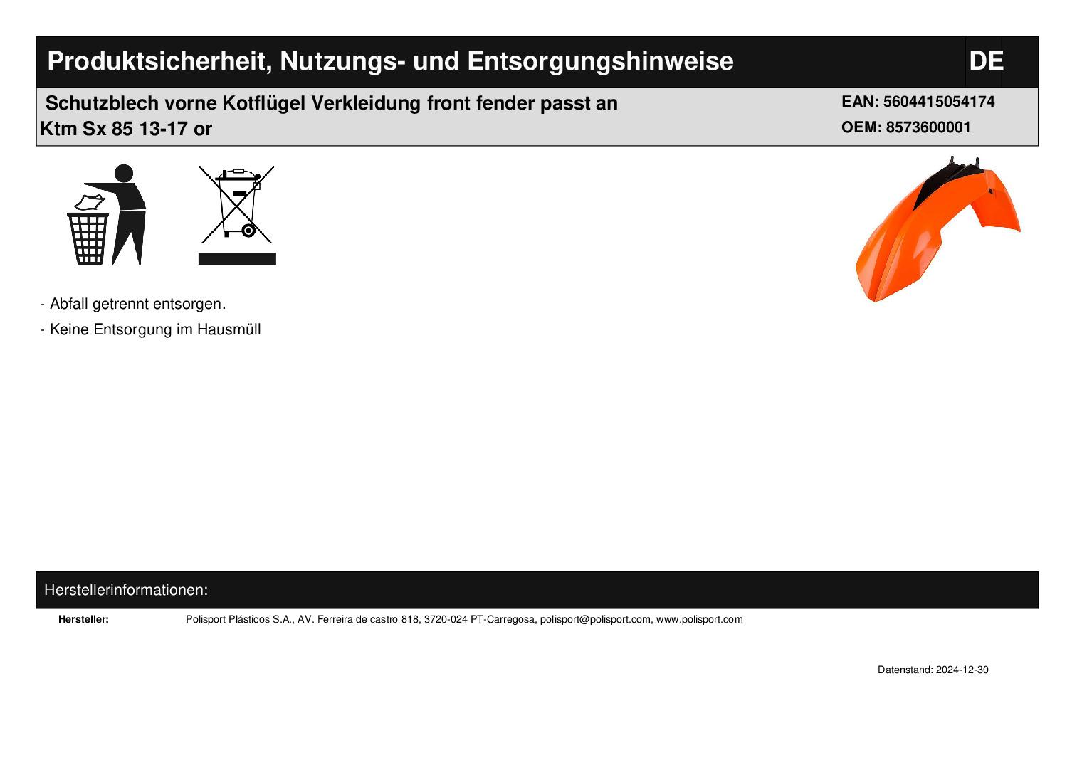 In dieser Auktion gibt es folgenden Artikel zu kaufen: Schutzblech vorne (siehe Foto) Fahrzeug: passend für Ktm SX 85 Bj.: 2013 - 2017 Lieferumfang: siehe Foto Artikelzustand: neu Es handelt sich hierbei um kein Originalteil Bei Unklarheiten oder Fragen bitte erst E-Mail schreiben.