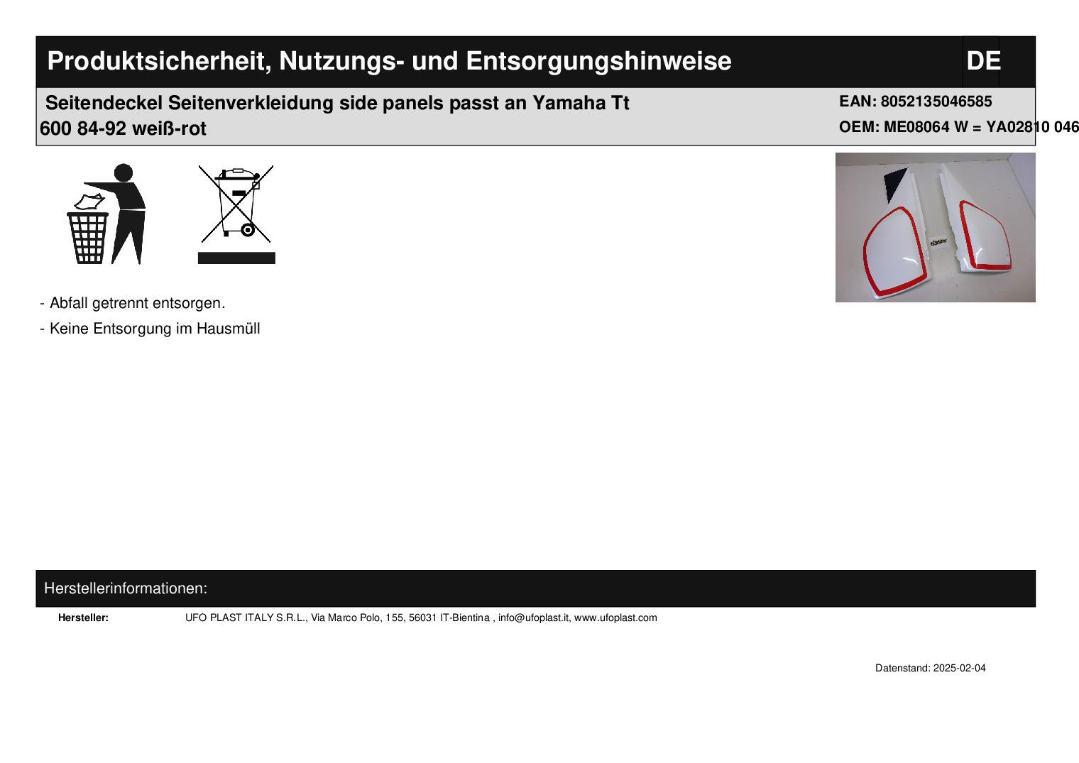 In dieser Auktion gibt es folgenden Artikel zu kaufen: Seitenverkleidung defekt (siehe Foto) Bild 1 und 2 dienen nur als Muster - Es wird Artikel auf Bild 2 - 4 verkauft - Schaden auf Bild 4 sichtbar! Fahrzeug: passend für Yamaha TT 600 Bj.: 1984 - 1992 (4-Takt) Lieferumfang: siehe Foto Artikelzustand: neu, allerdings ist ein Haltestift/Fixierstift verbogen; daher muss dieser ersetzt werden; Verkleidung wird aus diesem Grund als defekt verkauft! Bei Unklarheiten oder Fragen bitte erst E-Mail schreiben.