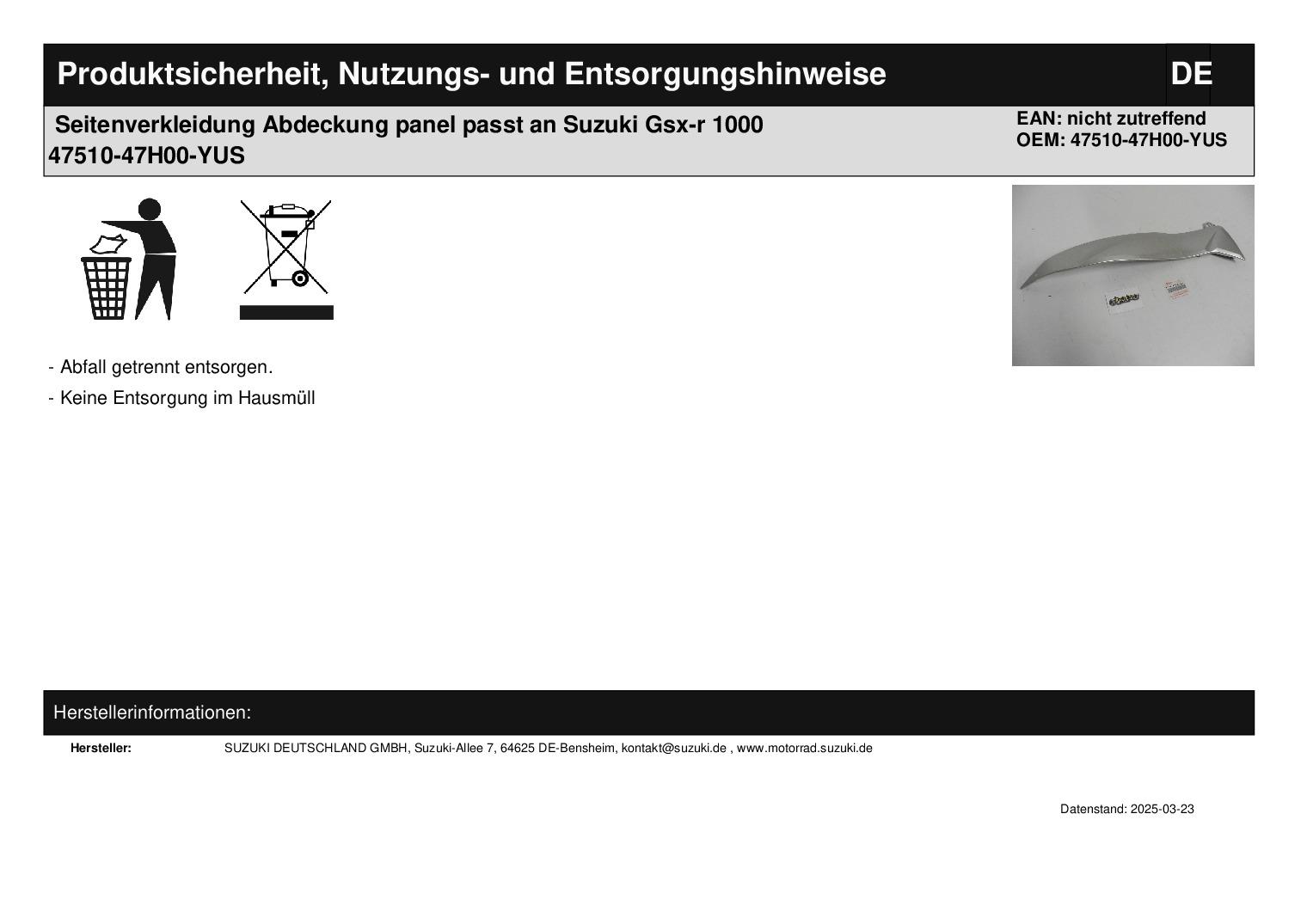 In dieser Auktion gibt es folgenden Artikel zu kaufen: Seitenverkleidung links (siehe Foto) Modell: passend für Suzuki GSX-R 1000 Bj.: 2009 Lieferumfang: siehe Foto Artikelzustand: neu Bei Unklarheiten oder Fragen bitte erst E-Mail schreiben.